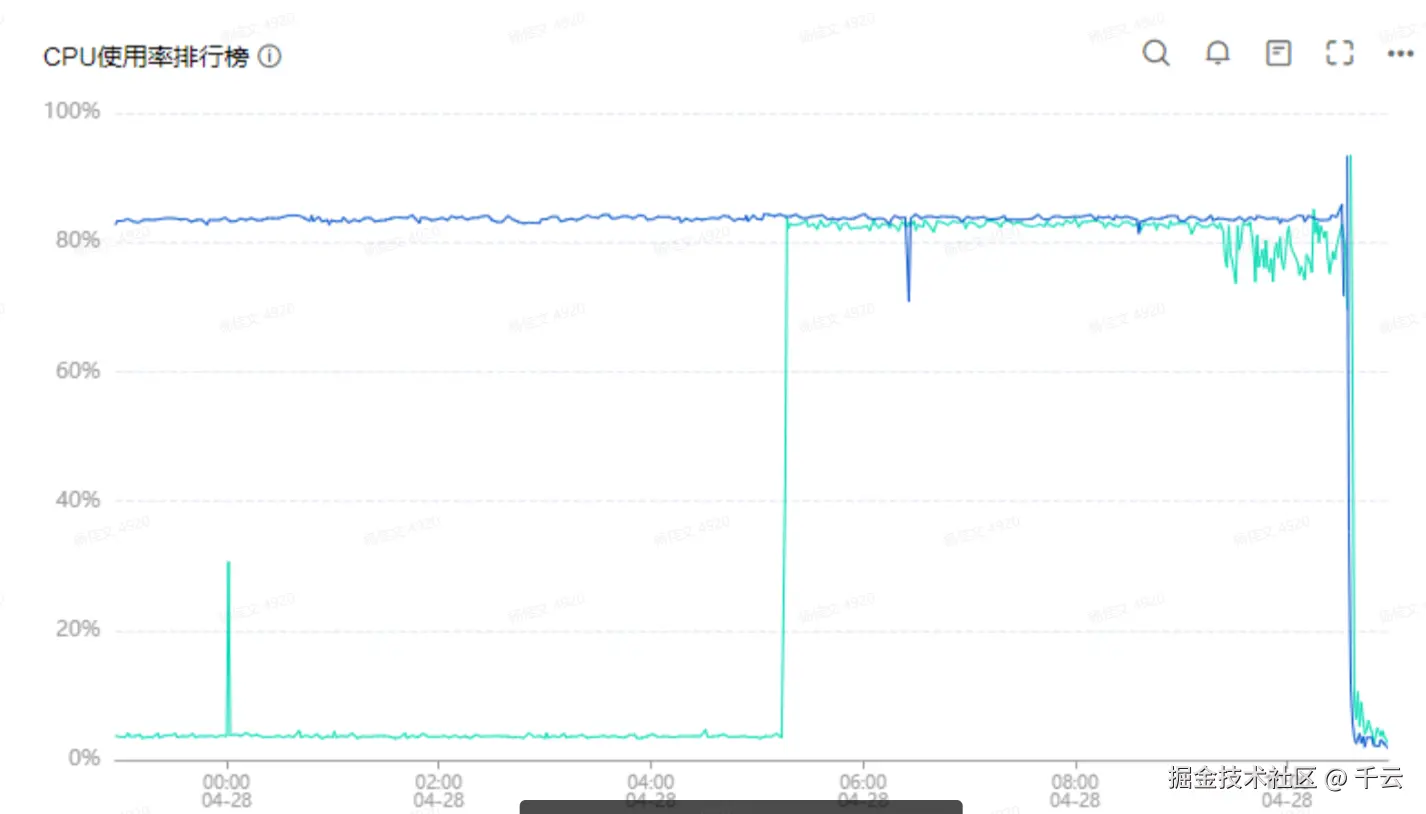 - 内存监控曲线平稳,无明显攀升,初步排除因堆内存溢出或大对象频繁GC导致CPU升高。