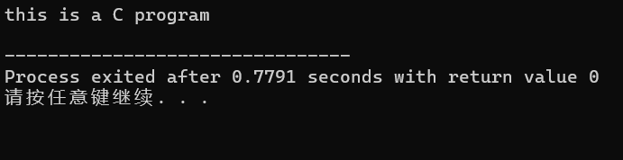 由此图可知成功生成"this is a C program",该运行过程出现过异常但后续修改代码和更换为devcpp已成功在黑色控制台窗口运行