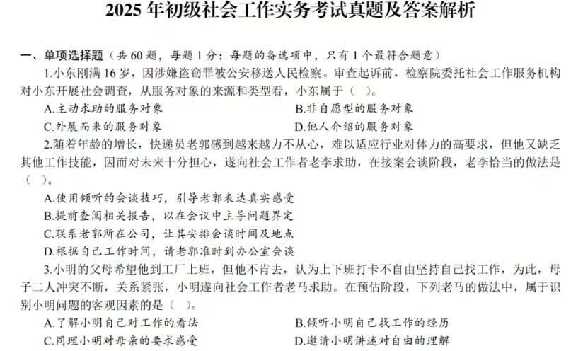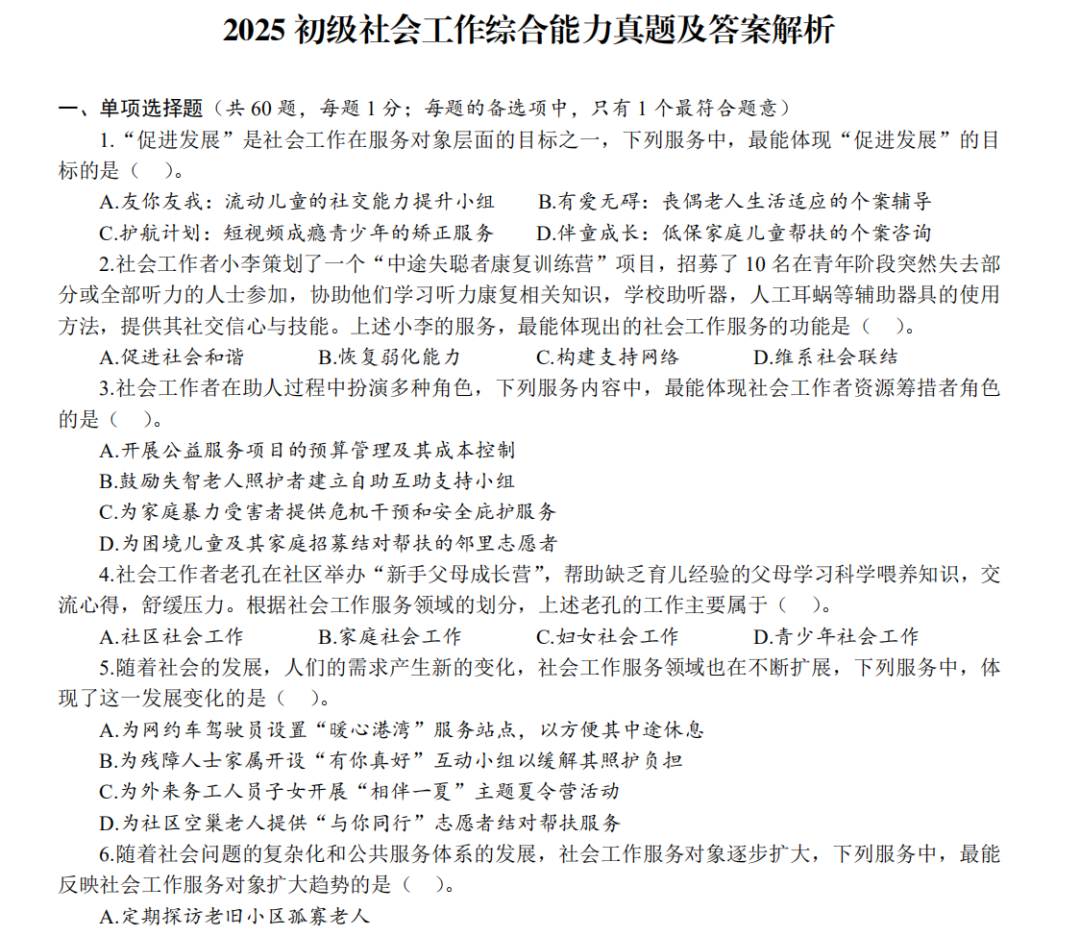 2026年初级社会工作者考试将于5月23日举行!为助力广大考生高效备考,小编精心整理了涵盖2010-2025年的初级社会工作者历年真题及答案解析(包含《社会工作实务》和《社会工作综合能力》),高清PDF电子版,可打印,方便大家随时下载学习。
