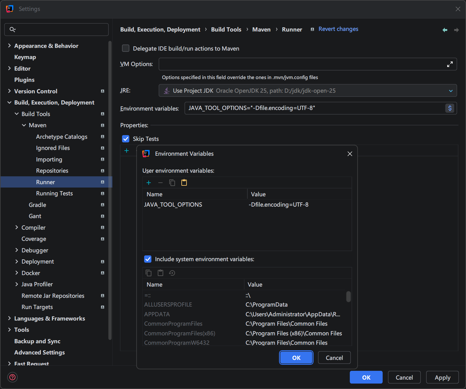 通过在 IDEA 中为 Maven 设置 JAVA_TOOL_OPTIONS 环境变量,强制 JVM 使用 UTF-8 编码。