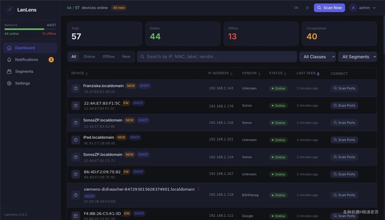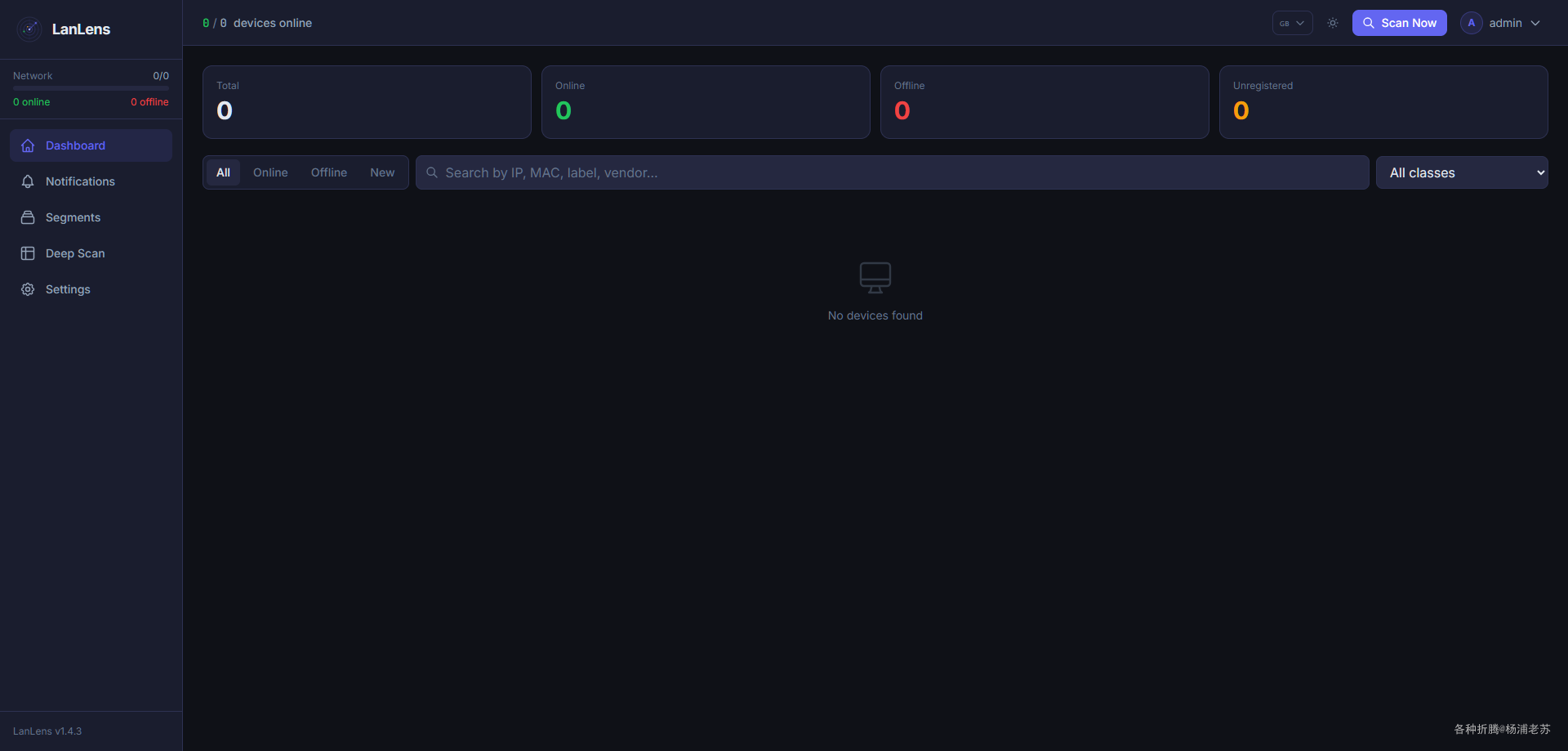 LanLens是一个开源的自托管网络监控和文档仪表盘,它能够持续扫描本地网络,通过MAC/IP地址识别每台设备,并提供一个简洁的深色主题Web界面,让用户可以管理、文档化和连接网络中的所有设备。
