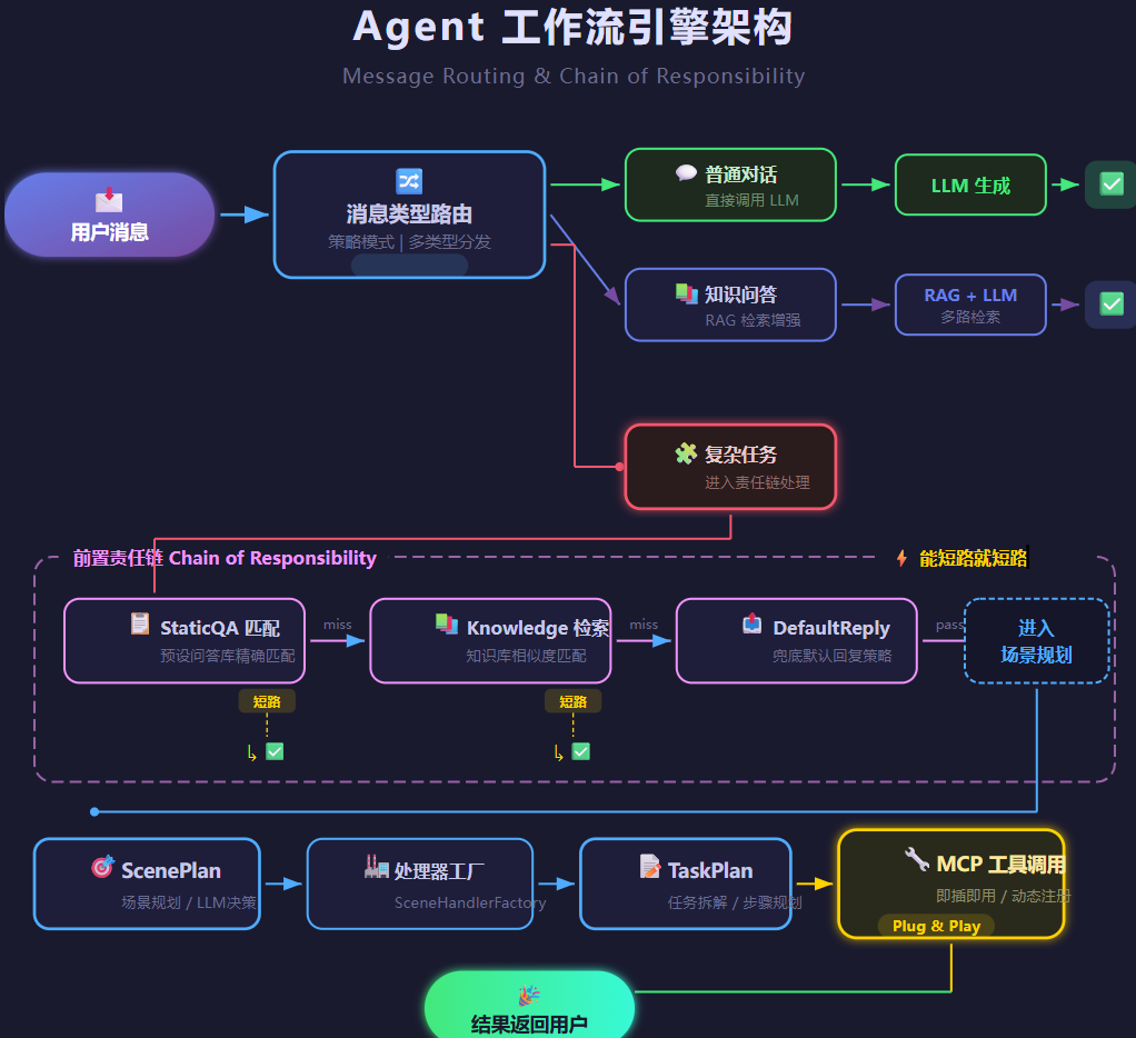 真正需要Agent介入的复杂请求,才交给LLM做场景规划------判断用户意图,拆解成子任务,再分发到对应的处理器去执行。