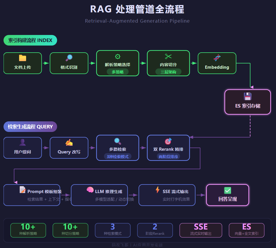 背后的链路是这样的:文档格式识别 → 内容解析 → 文本切分 → 向量化 → 存入向量库 → 用户提问时检索 → 检索结果精排 → Prompt拼装 → 调LLM → 流式输出。十几个环节,哪个崩了用户体验都是灾难。
