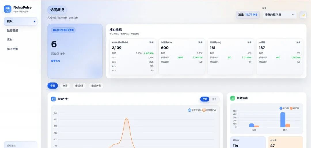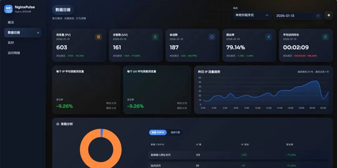 nginxpulse 是一个轻量的 Nginx 访问日志分析面板------Docker 一条命令拉起来,自动解析日志,图表展示 PV/UV、IP 归属地、状态码分布、客户端占比。