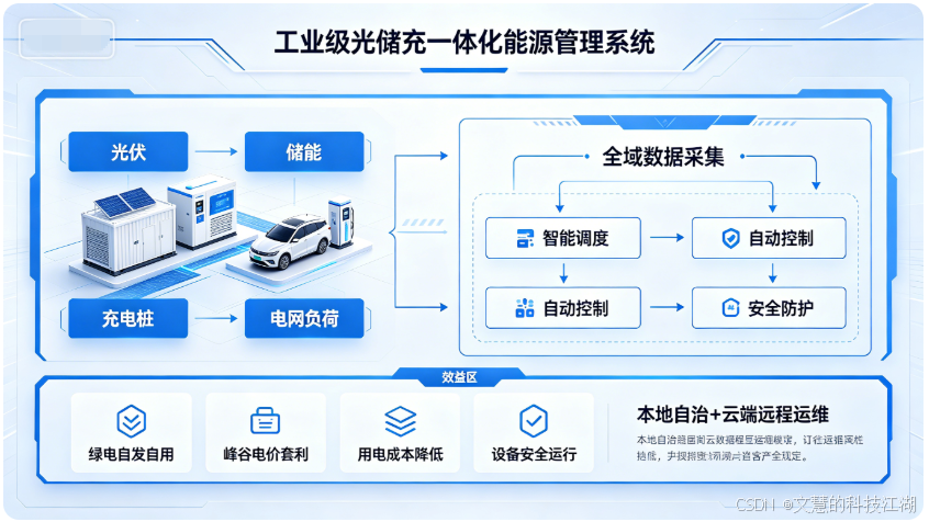 打造工业级、高可靠、全闭环的光储充一体化能源管理系统,实现光伏、储能、充电桩、电网负荷的全域数据采集、智能调度、自动控制、安全防护,帮助客户实现绿电自发自用、峰谷电价套利、用电成本降低、设备安全运行,支持本地自治 + 云端远程运维双重模式。