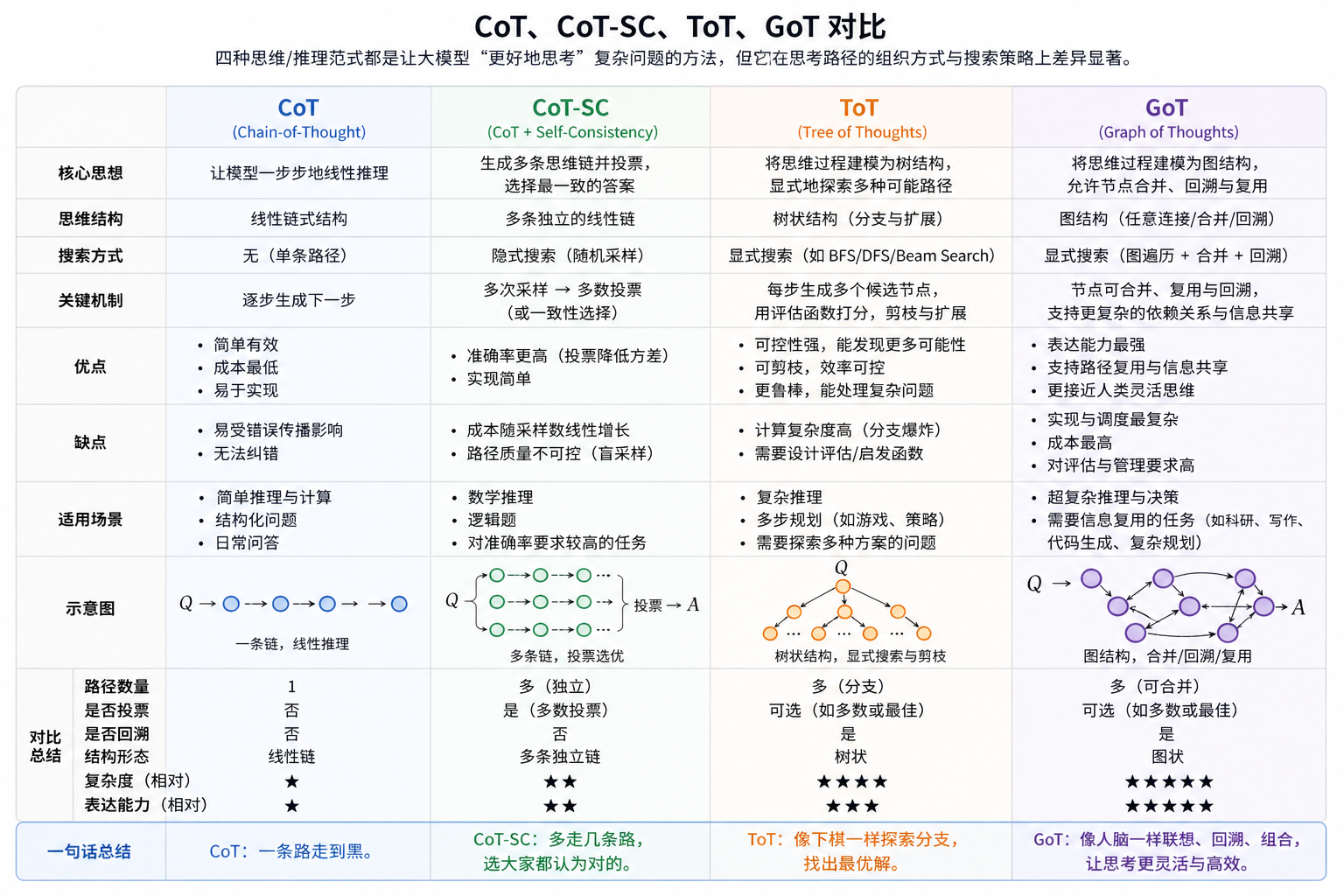 | CoT | List | ⭐ | 显式推理链 | 单路径 |