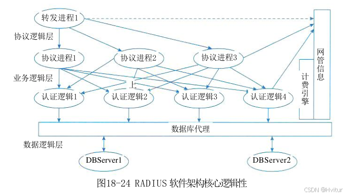 RADIUS软件架构分为三个层面:协议逻辑层、业务逻辑层和数据逻辑层