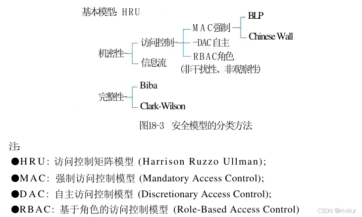当前比较被公认的模型有:状态机模型 (State Machine Model)、Bell-LaPadula(BLP) 模型、Biba模型、 Clark-Wilson(CWM) 模型、 ChineseWall 模型,以及信息流模型 (Information FlowModel)、 非干涉模型 (Noninterference Model)、 格子模型 (Lattice Model)、Brewer and Nash模型和 Graham-Denning模型等。