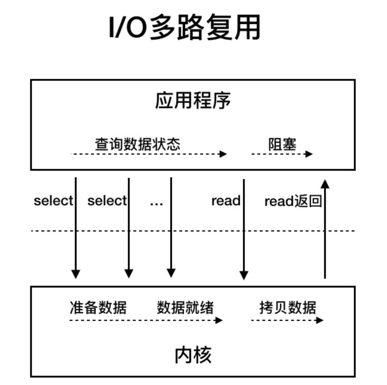 该模型轮询的目的只是检测"单个 IO 数据是否已经就绪",操作系统提供了更为高效的检测接口,一次检测多个 IO 数据是否已经就绪,这就是接下来的 IO 多路复用。