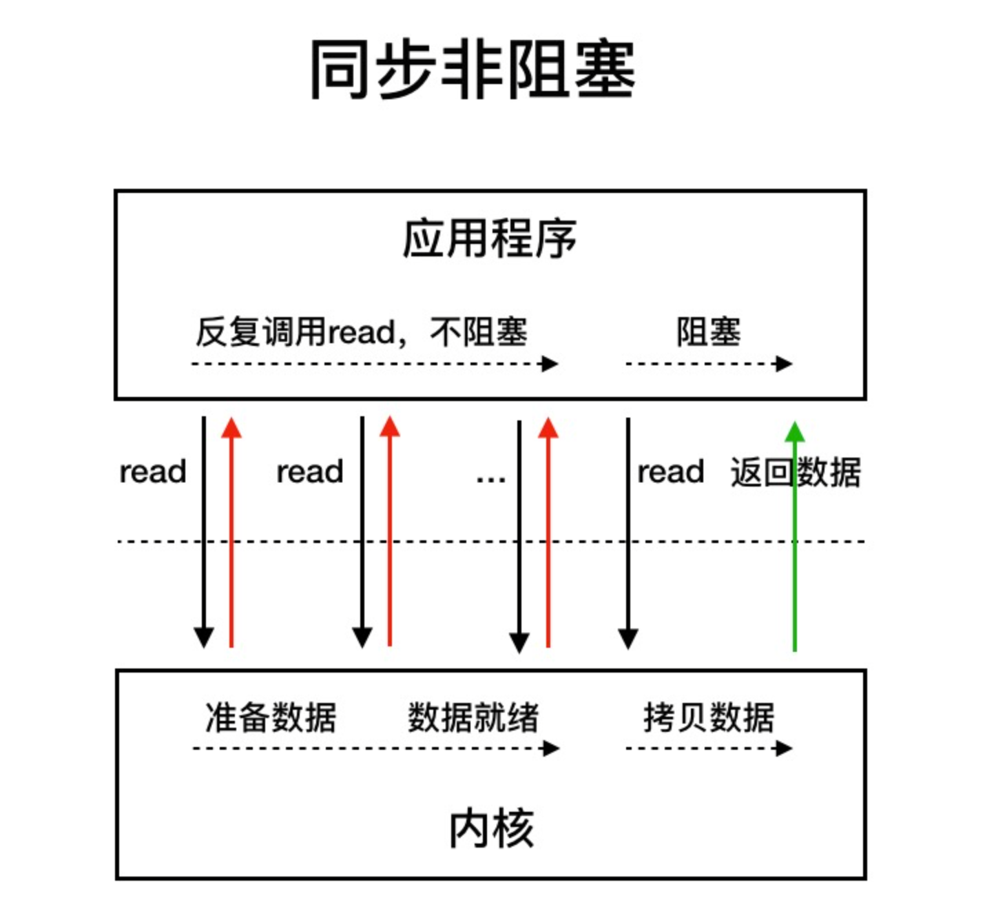 用户线程不断的发起 read 调用,数据没到内核空间时,每次都返回失败,直到数据到了内核空间,这一次 read 调用后,在等待数据从内核空间拷贝到用户空间这段时间里,线程还是阻塞的,等数据到了用户空间再把线程叫醒。