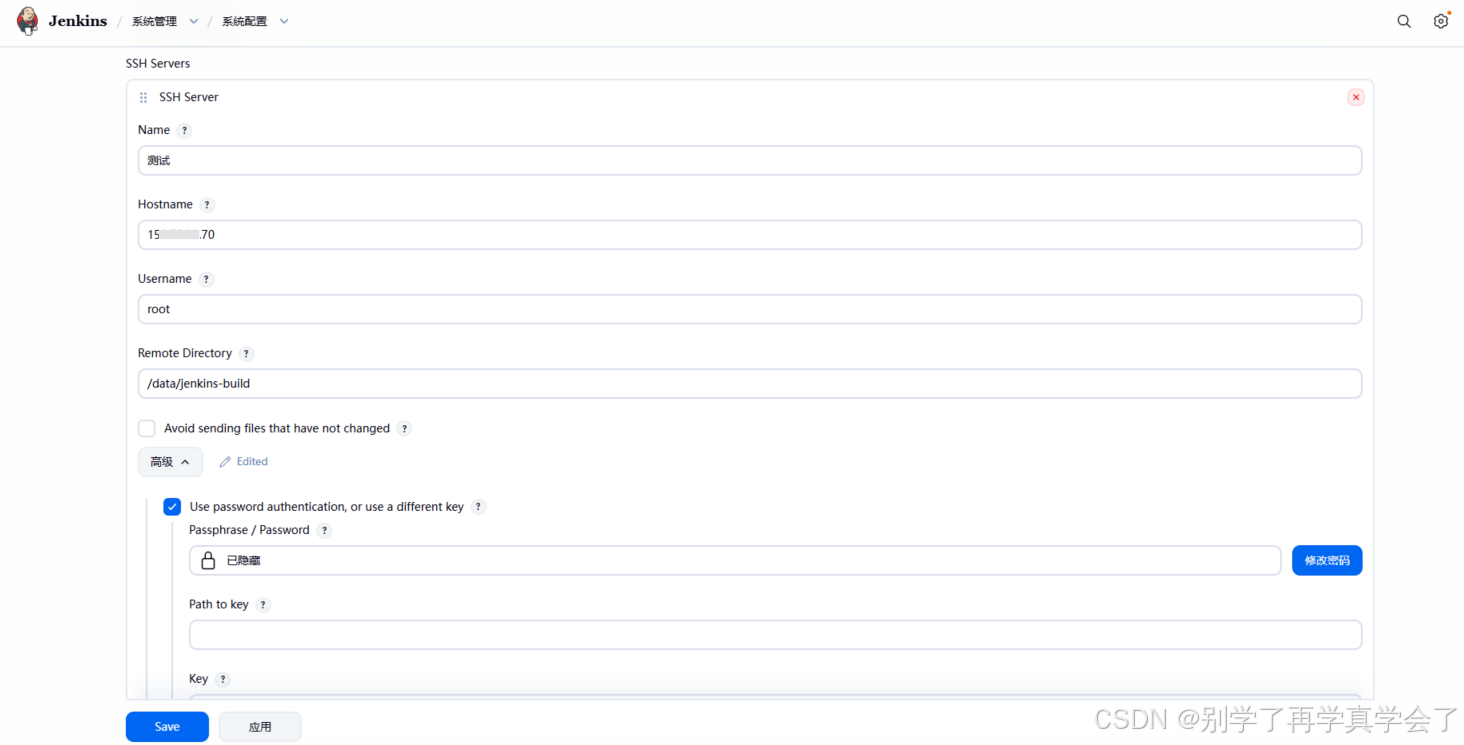 configName: "测试", // 必须与Jenkins系统配置中SSH服务器名称一致!
