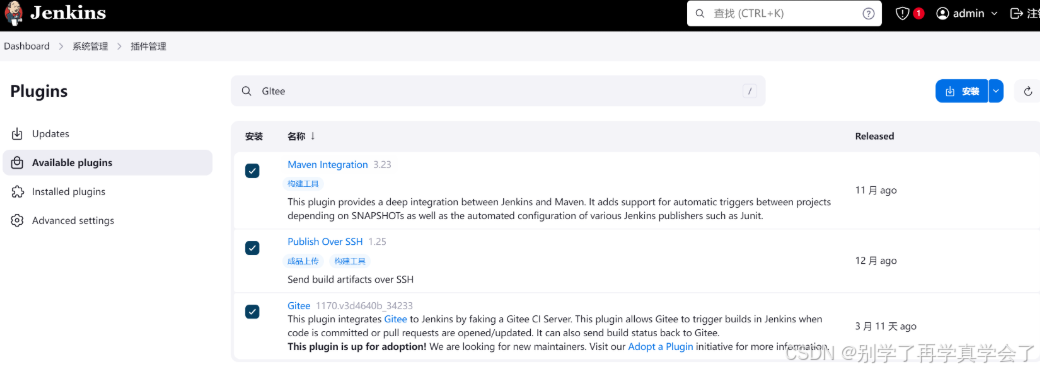 系统管理-插件管理-availabe plugins,搜索插件名称进行安装