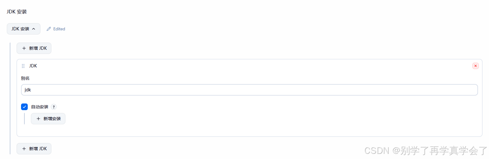 在Jenkins的系统管理 -> "全局工具配置 "中,找到JDK配置部分,点击"添加JDK",指定JDK的安装路径,或者选择自动安装。