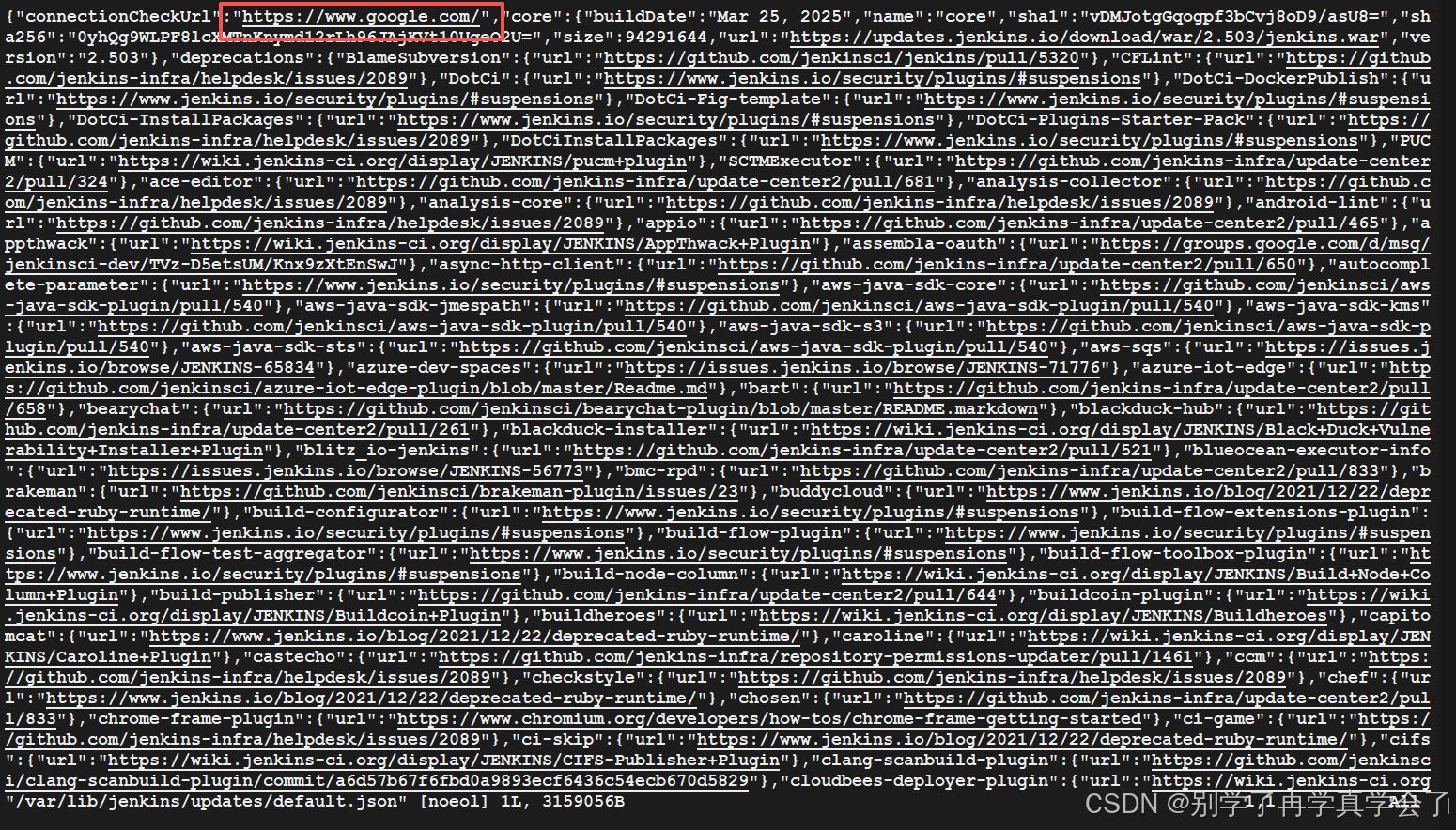 该文件为jenkins下载插件的源地址,默认为:https://updates.jenkins.io/update-center.json 我们改成其他国内备用地址https://mirrors.huaweicloud.com/jenkins/updates/update-center.json 此为华为插件镜像
