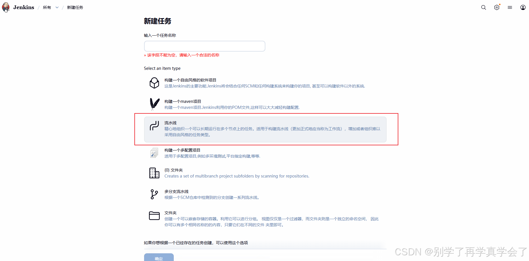 1.新建任务 → 自定义用户名称 → 选择 流水线(Pipeline) → 确定