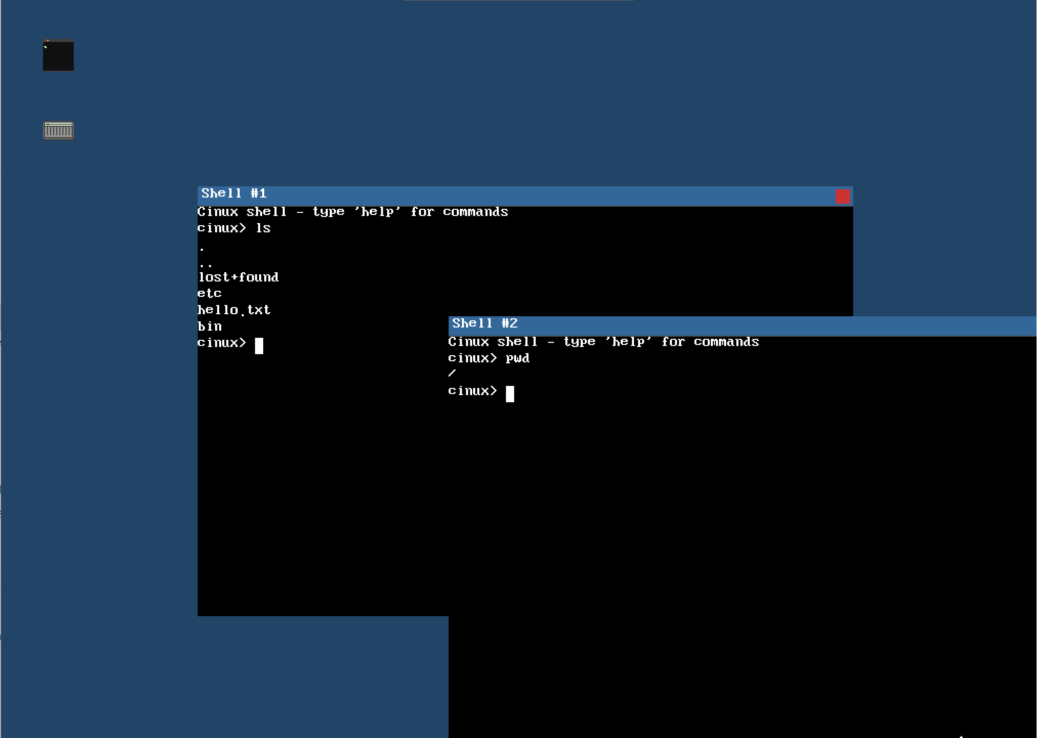 这是 Cinux 的 GUI 桌面环境。画面上有可拖动的窗口,有桌面图标可以点击启动终端,鼠标是真实可用的 PS/2 鼠标驱动,窗口之间支持 Z-order 层叠。这不是一张静态截图------整个窗口管理器、Canvas 双缓冲渲染、鼠标事件分发,是内核自己实现的。