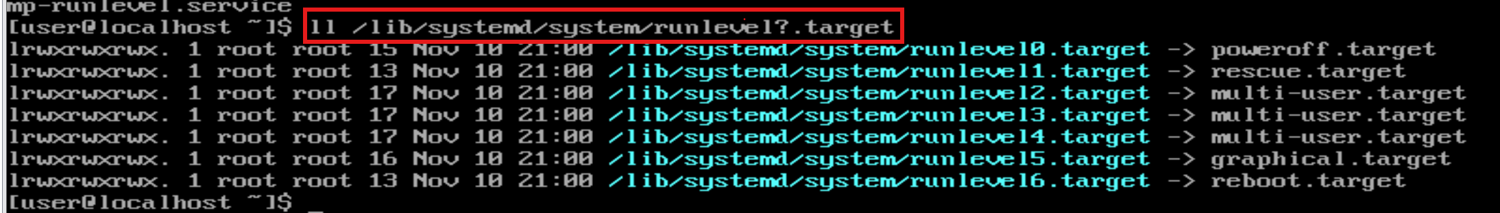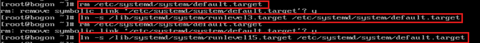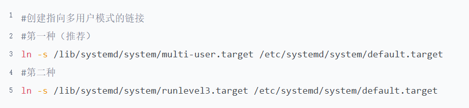 #创建指向多用户模式的链接 #第一种(推荐) ln -s /lib/systemd/system/multi-user.target /etc/systemd/system/default.target #第二种 ln -s /lib/systemd/system/runlevel3.target /etc/systemd/system/default.target