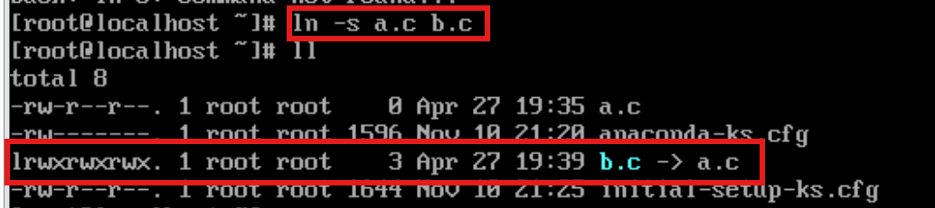 将a.c命名为d.c ,软连接失效,a.c 已经不存在了,b.c 会变成 "断链" 状态,无法读取内容