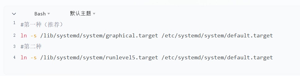 #第一种(推荐) ln -s /lib/systemd/system/graphical.target /etc/systemd/system/default.target #第二种 ln -s /lib/systemd/system/runlevel5.target /etc/systemd/system/default.target