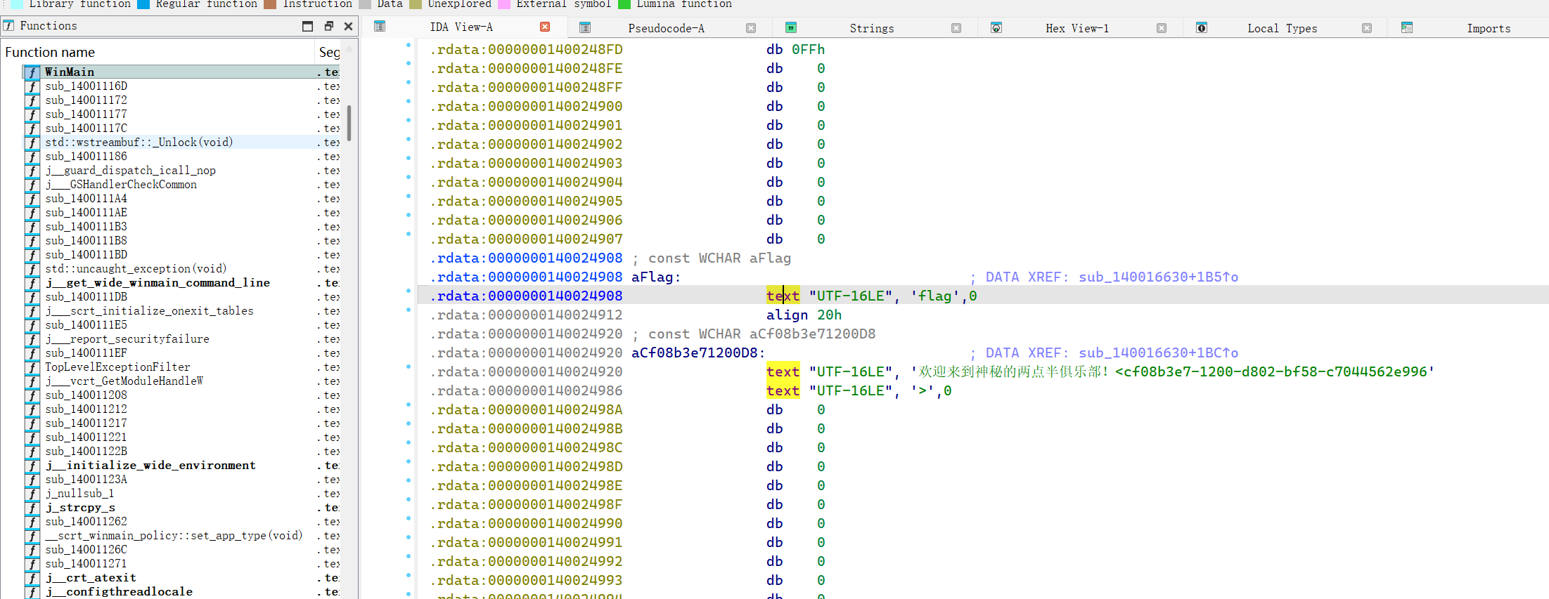 程序是让输入通行证和卡密。进入ida,搜字符串直接找到了flag,可能需要改编码模式,按A重定义即可