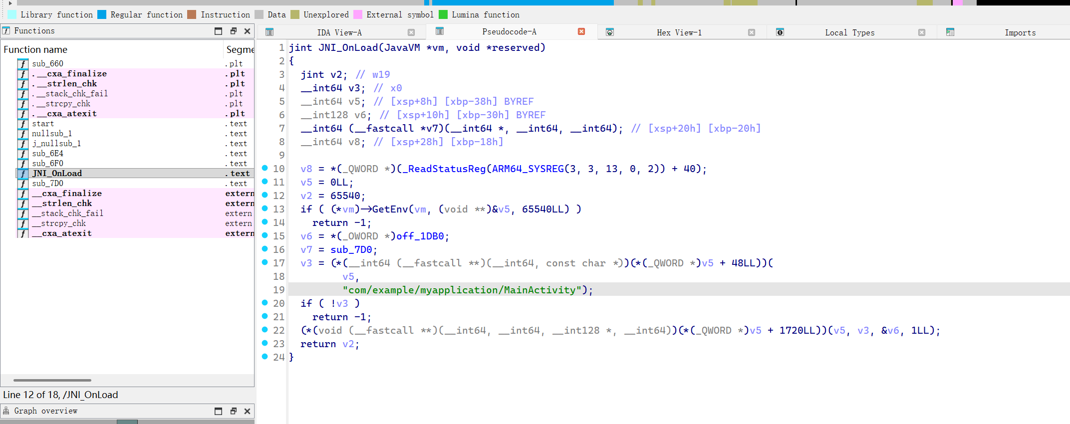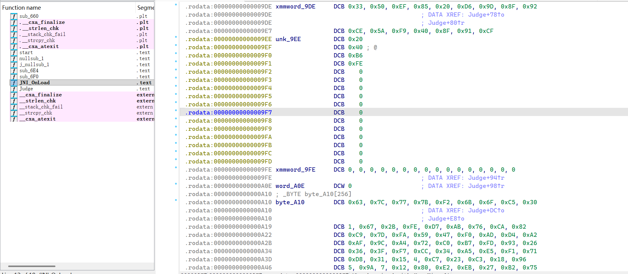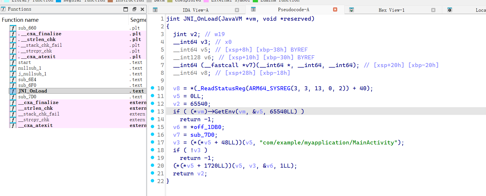 进入ida,找到JNI_OnLoad,或者查找字符串,注意8.3版本的ida反编译不了