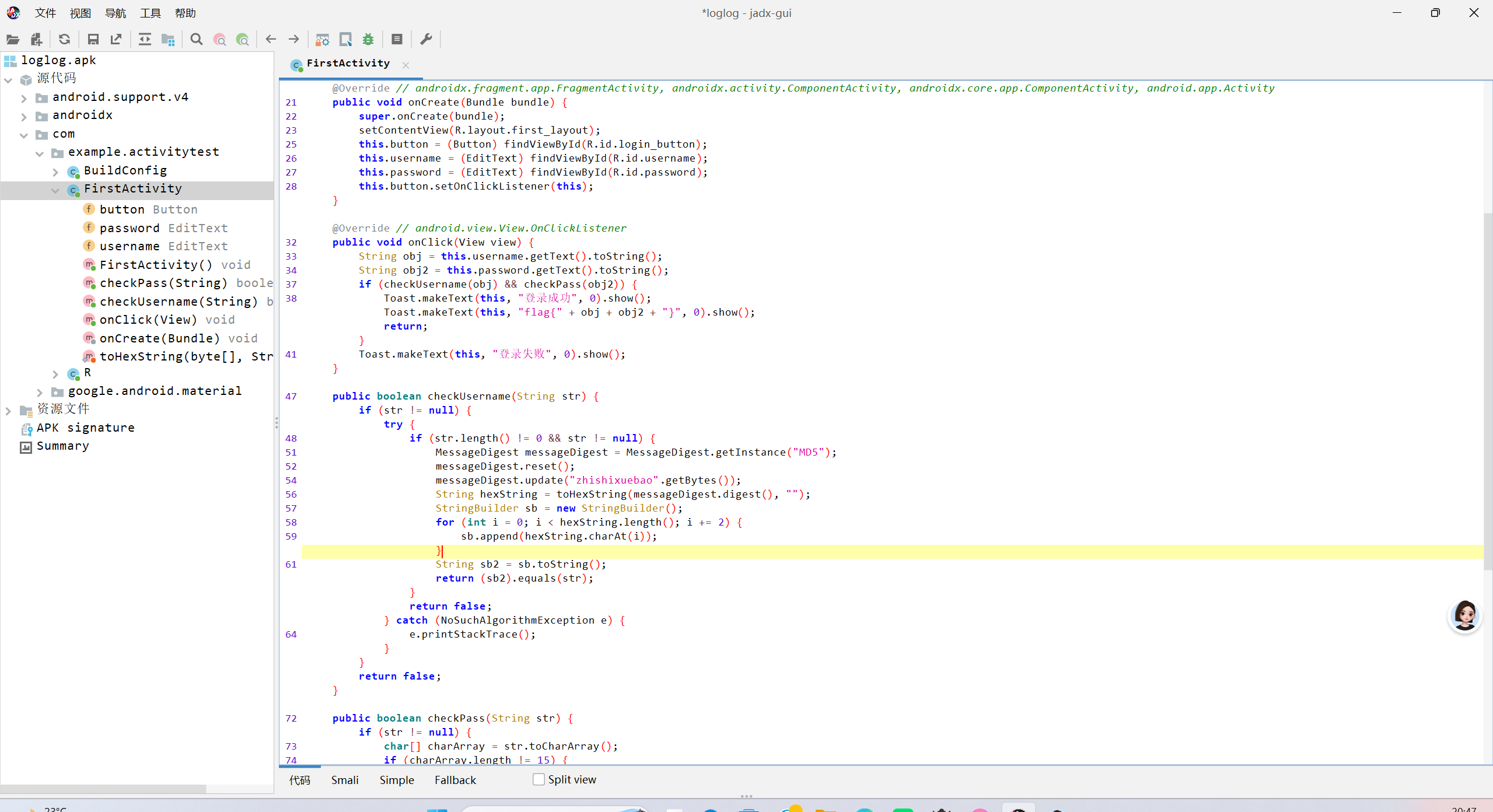 apk文件,打开程序是验证登陆密码。逆向分析,找到MainActivity1函数