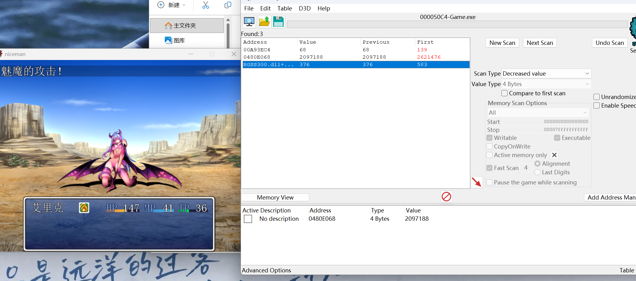 那么我们就需要找到怪物或者自己的血量,可以先用准确数字首次击打,发现有很多,说明有很多数字跟血量无关,只是数字一样,那么我们要继续击打,但是会发现继续浏览就没有此数字,说明存在加密