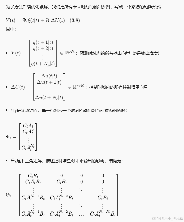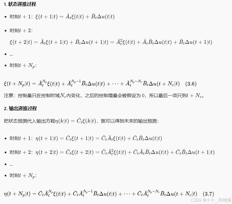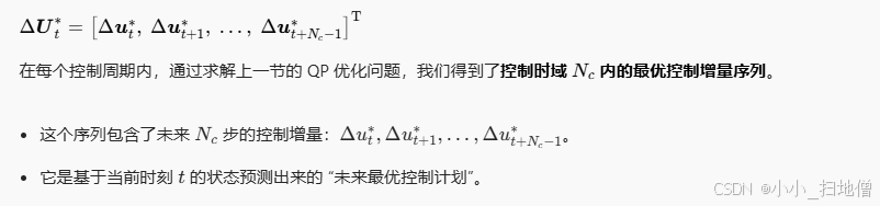 - 在下一个控制周期 t+1,控制器会根据新的状态信息,重新预测未来的输出,求解新的控制增量序列;