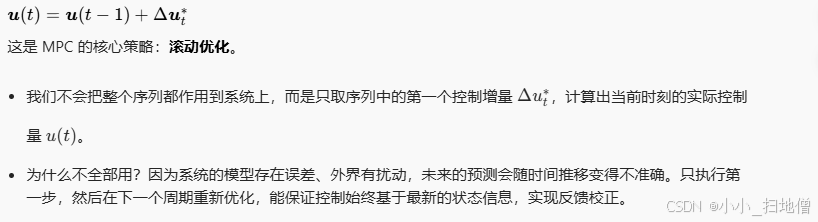 - 状态反馈:每个周期都基于当前最新的系统状态(x(t))重新预测,修正了模型误差和扰动带来的偏差;