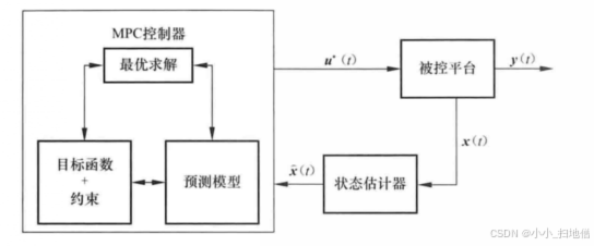 模型预测控制原理框图包含了MPC控制器、被控平台和状态估计器 这3个模块。其中,MPC控制器结合预测模型、目标函数和约束条件进行最优化求解,得到当前时刻的最优控制序列u(t),输入到被控平台,被控平台按照当前的控制量进行控制,然后将当前的状态量观测值x(t)输入给状态估计器。