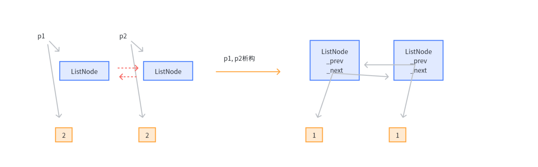 首先p1出现后,接管1号节点,1号节点的shared_count为1,p2出现,接管2号节点,p2的shared_count为1,p1->_next=p2,2号节点weak_count为1,p2->_prev=p1,p1的weak_count为1,p2先销毁,2号节点的shared_count=0,释放二号节点,p2的_prev也要销毁,此时节点1的weak_count=0,但是节点1的shared_count不为0,所以不释放1号节点的控制块;接着,p1销毁,1号节点的shared_count为0,释放1号节点,且此时1号节点的weak_count为0,释放1号节点控制块;同时1号节点的_next析构,导致2号节点的weak_count为0,释放二号节点的控制块