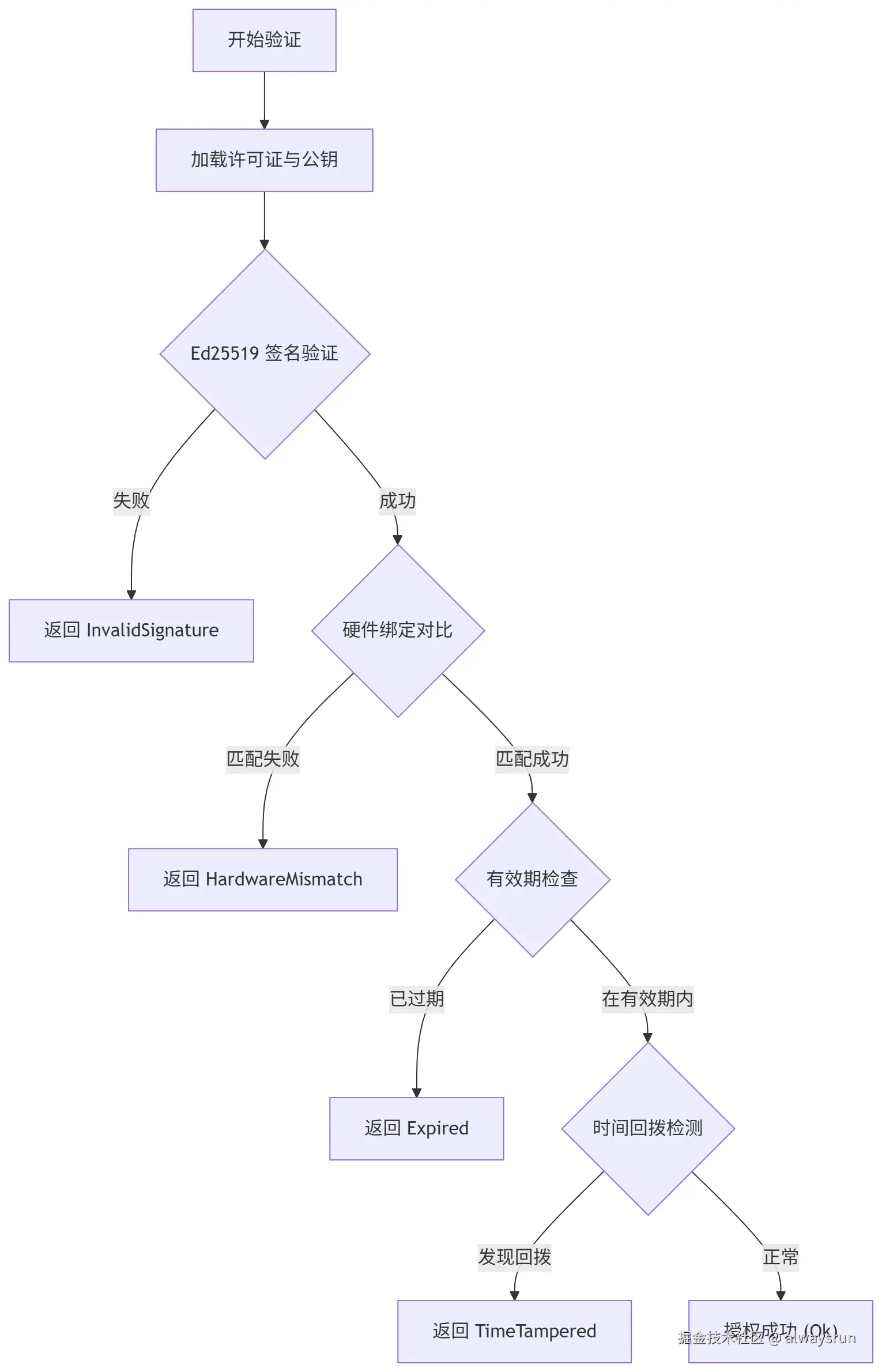 核心是:基于高性能、难以破解的非对称加密算法 Ed25519对授权载体进行数字签名;同时通过位标志(Bitflags)灵活定义硬件绑定策略,将软件与主机的唯一指纹深度耦合。