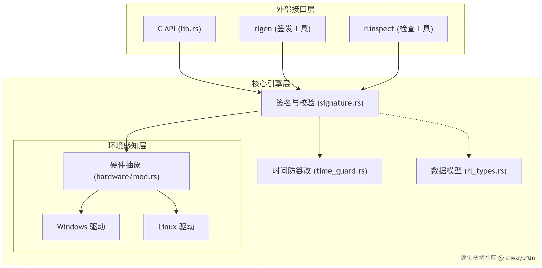 RLicen 采用了分层解耦的设计,确保核心验证逻辑不依赖于具体的交互形式(无论是 C 接口还是 CLI)。