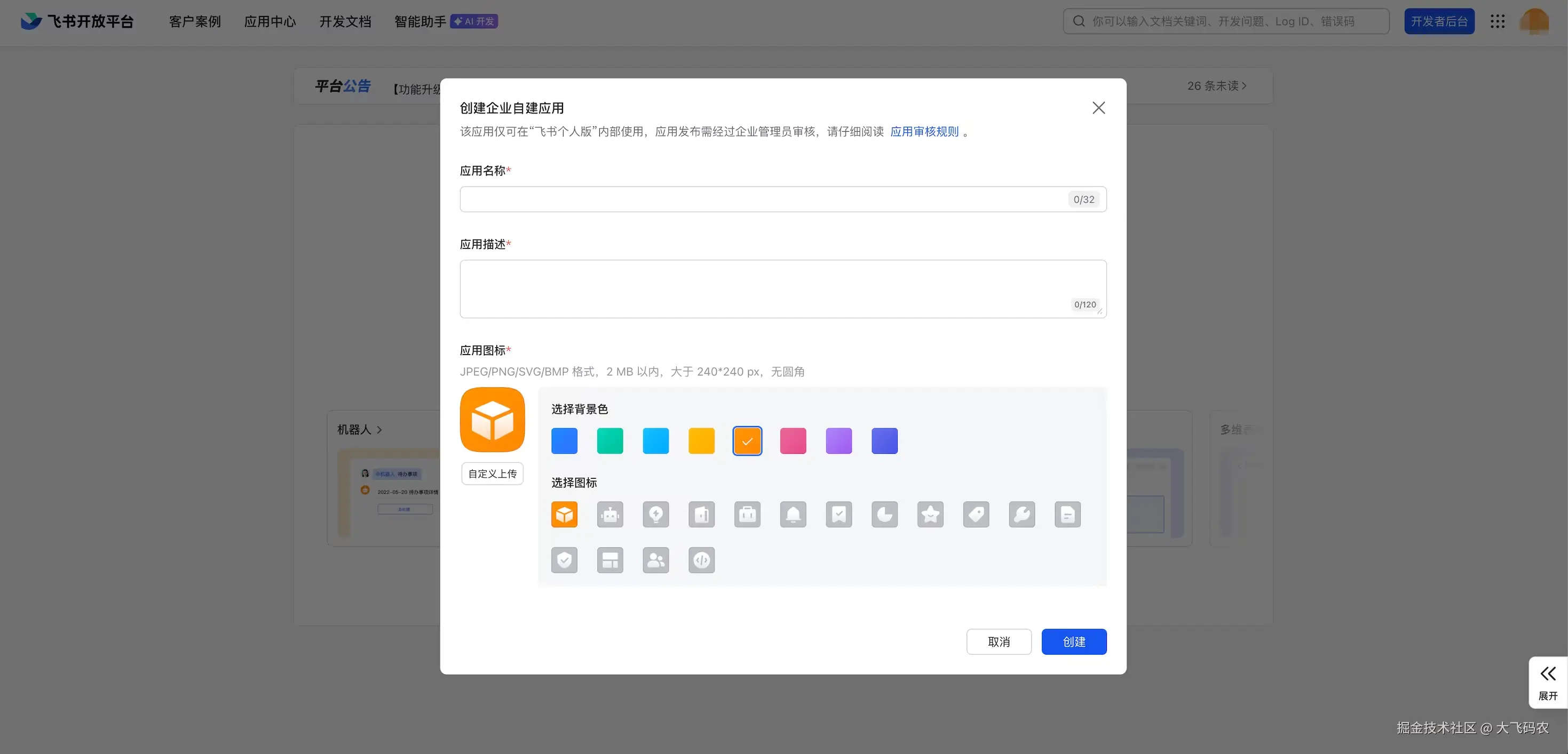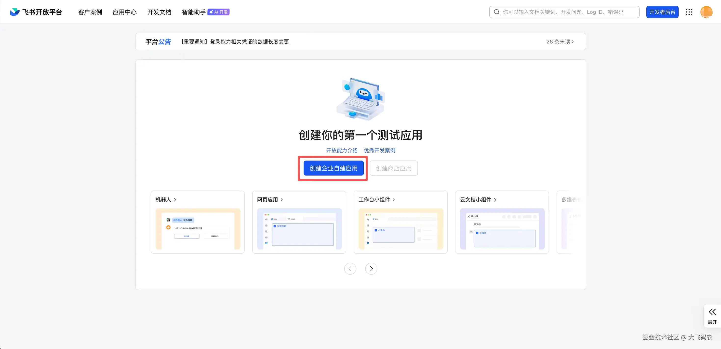 - 进入开发者后台,选择创建企业自建应用。填写"应用名称"和"应用描述"完成创建。