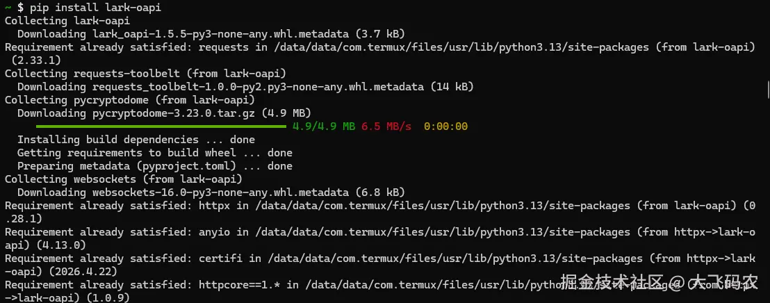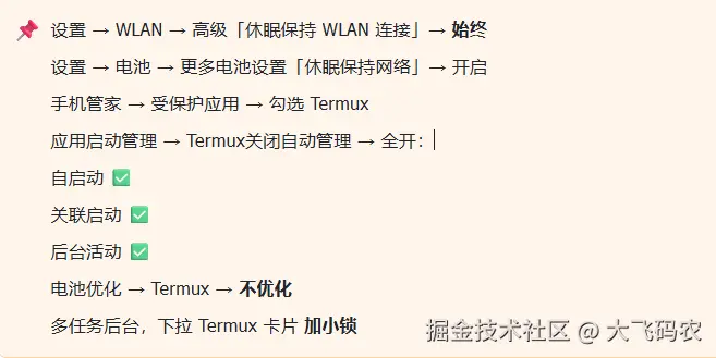 无需高价订阅、不用服务器、不用复杂配置,依托 Termux 本地部署 + 后台保活 + 崩溃自启方案,搭配飞书快速搭建专属智能机器人,息屏不断连、掉线自动重连、后台永久挂机,个人办公、日常问答、私域辅助全都能用,今天分享一套完整可复刻的实操教程,新手也能一键照搬。