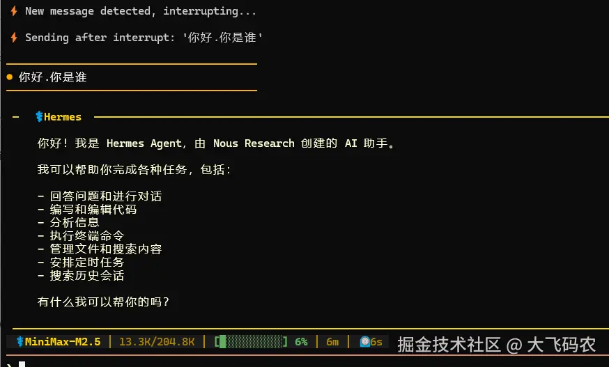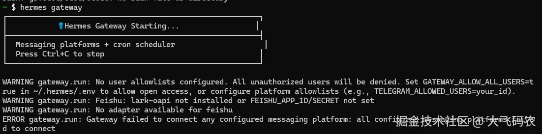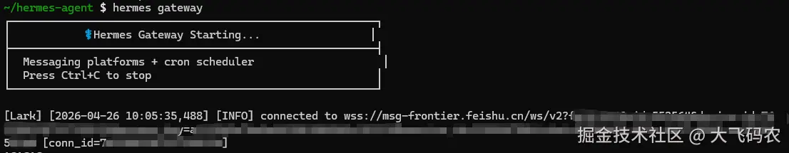执行完后,你会看到一个数字(进程 ID),就代表成功了!看到 hermes gateway 就说明在线。