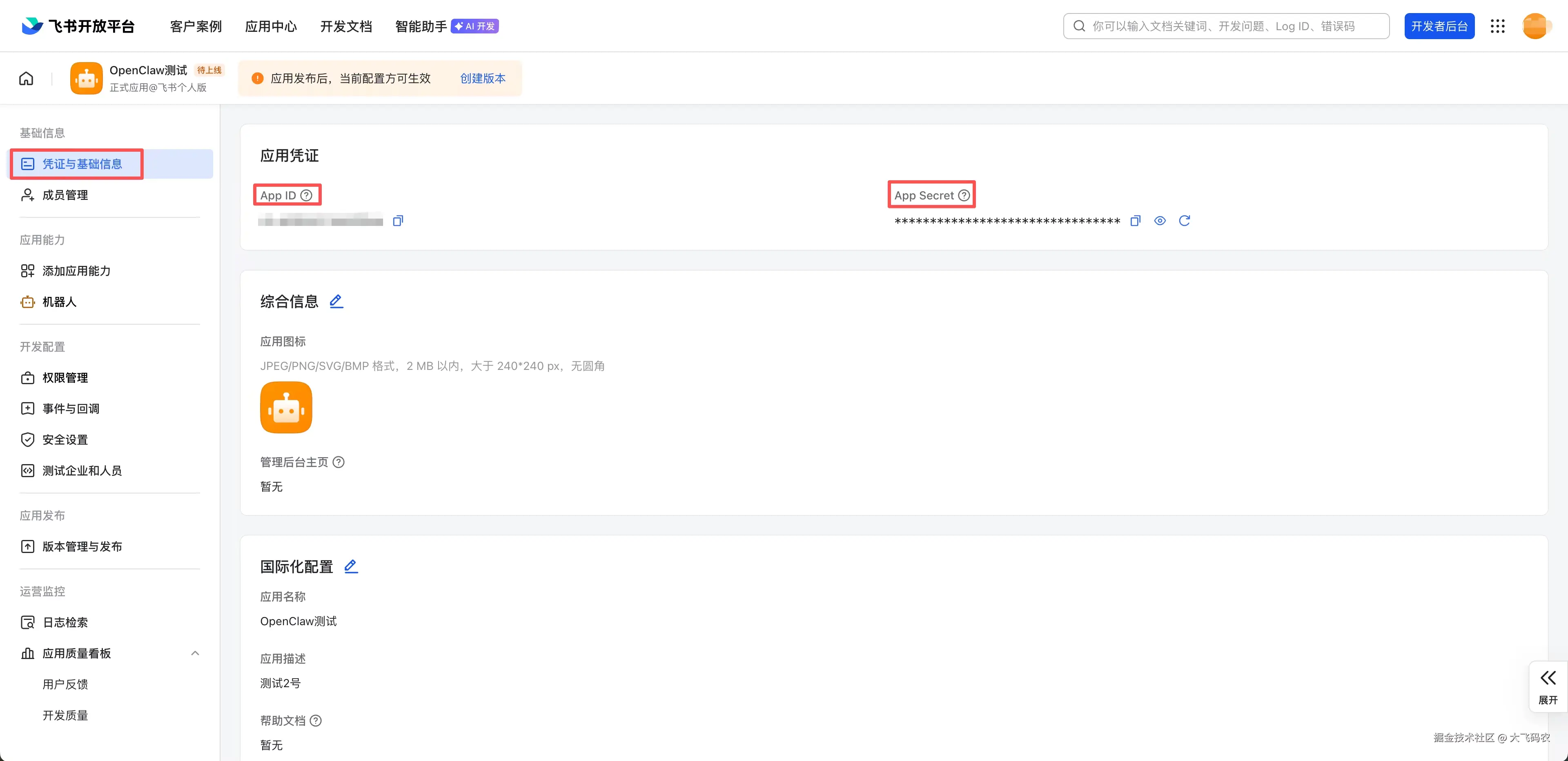 - 在左侧菜单选择凭证与基础信息,获取 App ID 与 App Secret,后续步骤中将会使用。