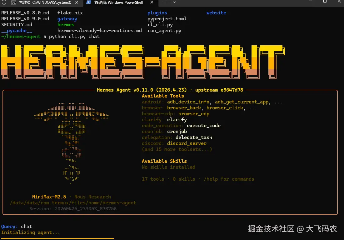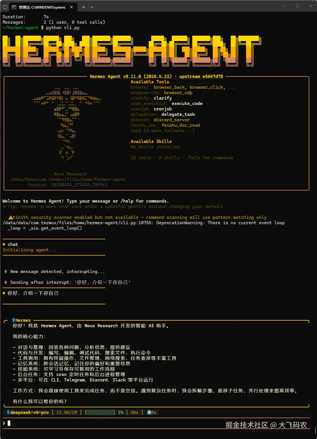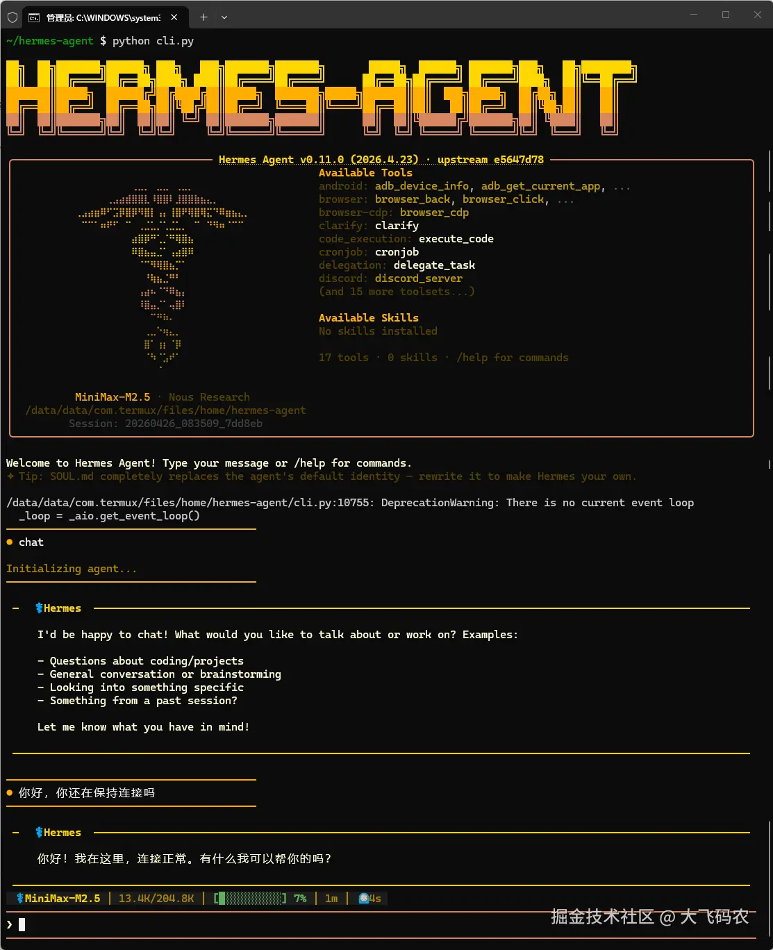 Hermes(Hermes Agent)目前没有原生安卓 App,只能用 Termux + Linux 环境 在安卓手机上安装运行。