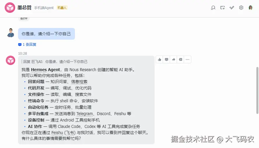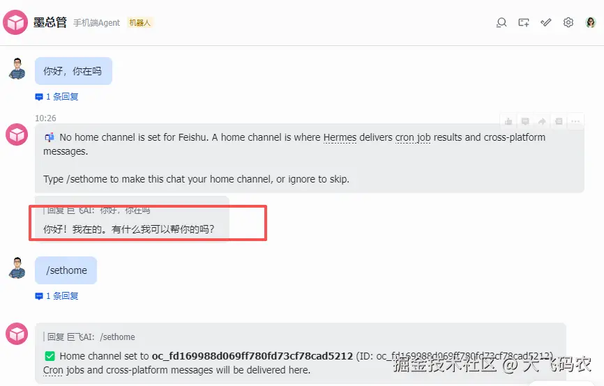 太棒了,到这里已经成功连接到飞书了,我们的零成本私人小助手已经初步成了。