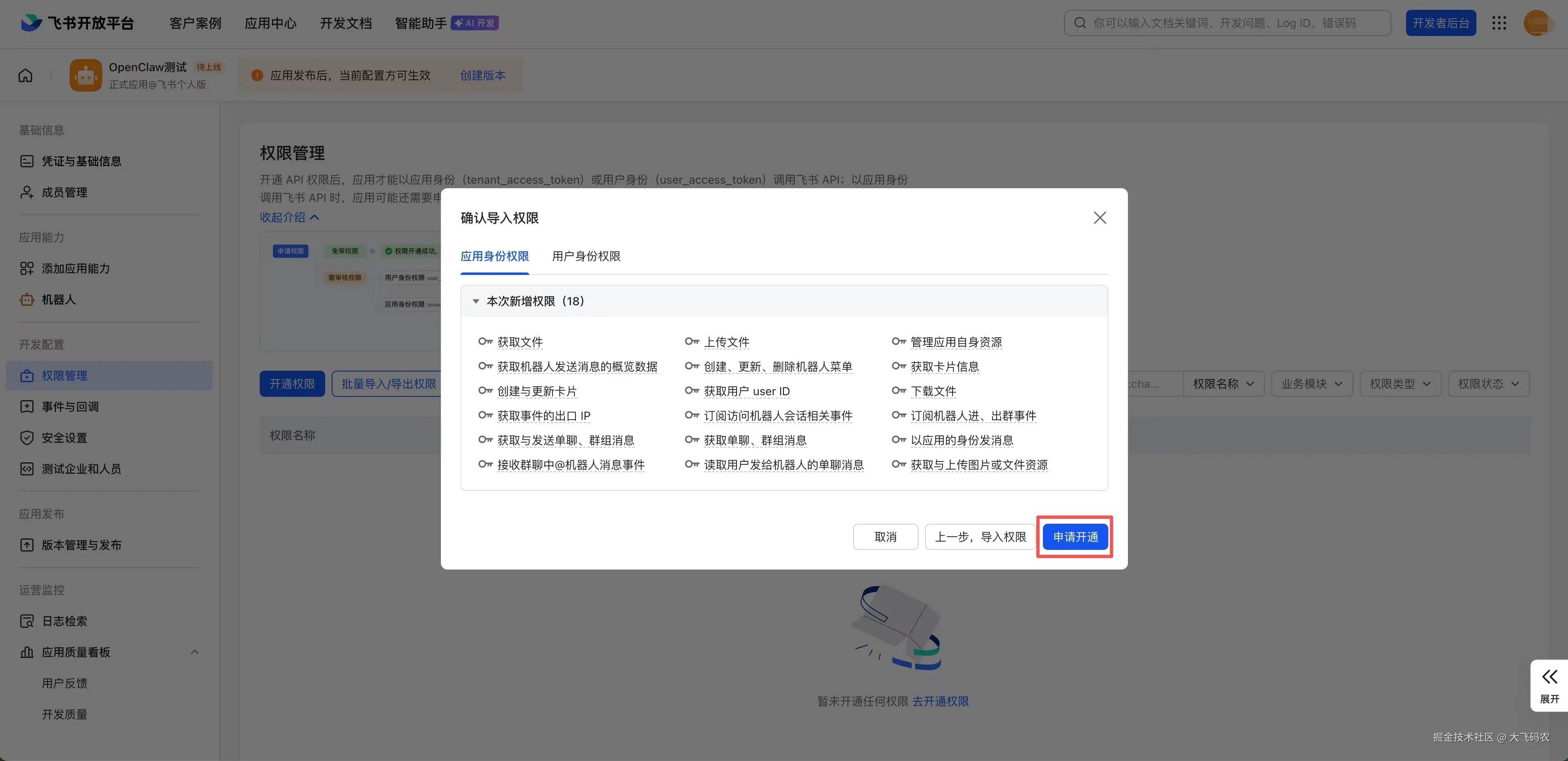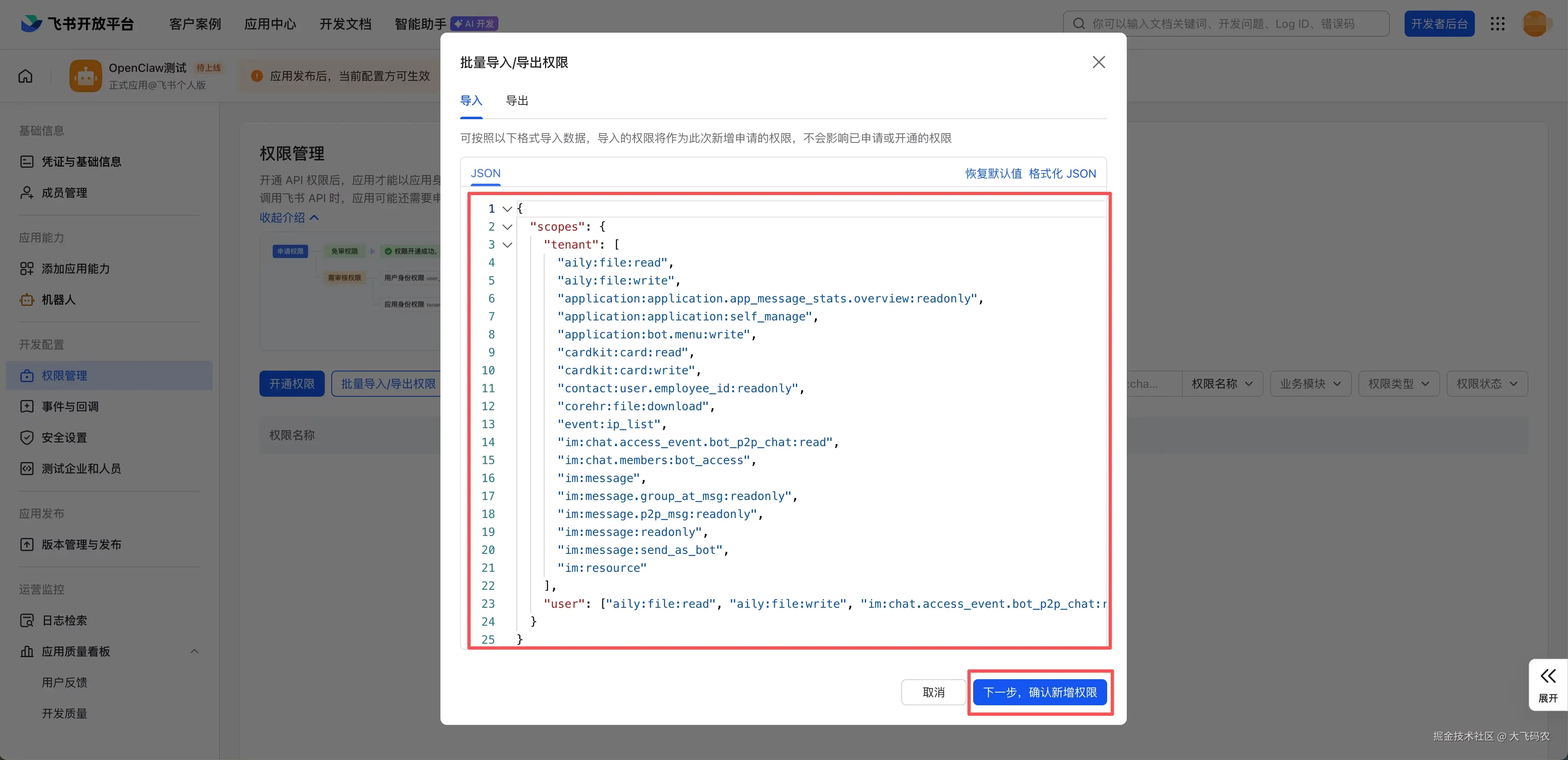 - 复制下方代码,粘贴导入,单击确认新增权限,完成开通。