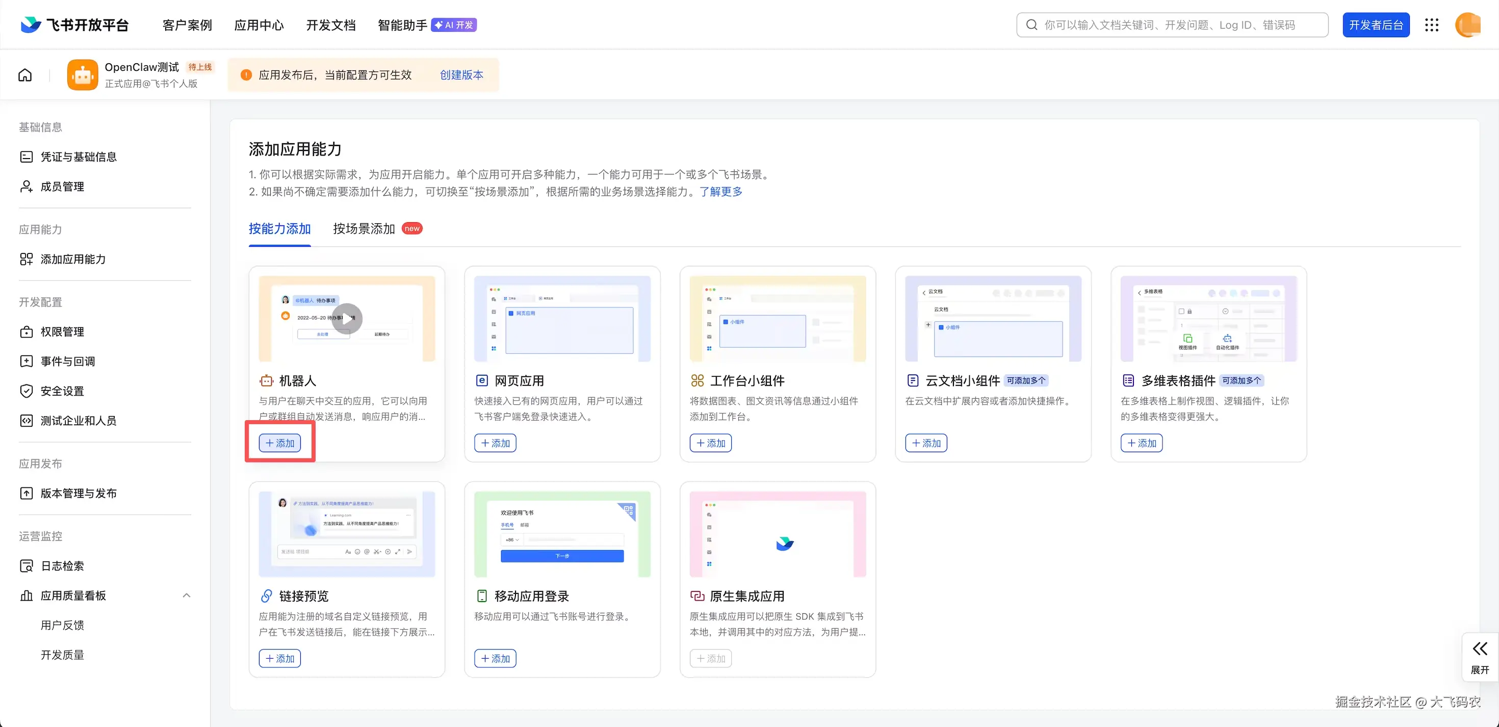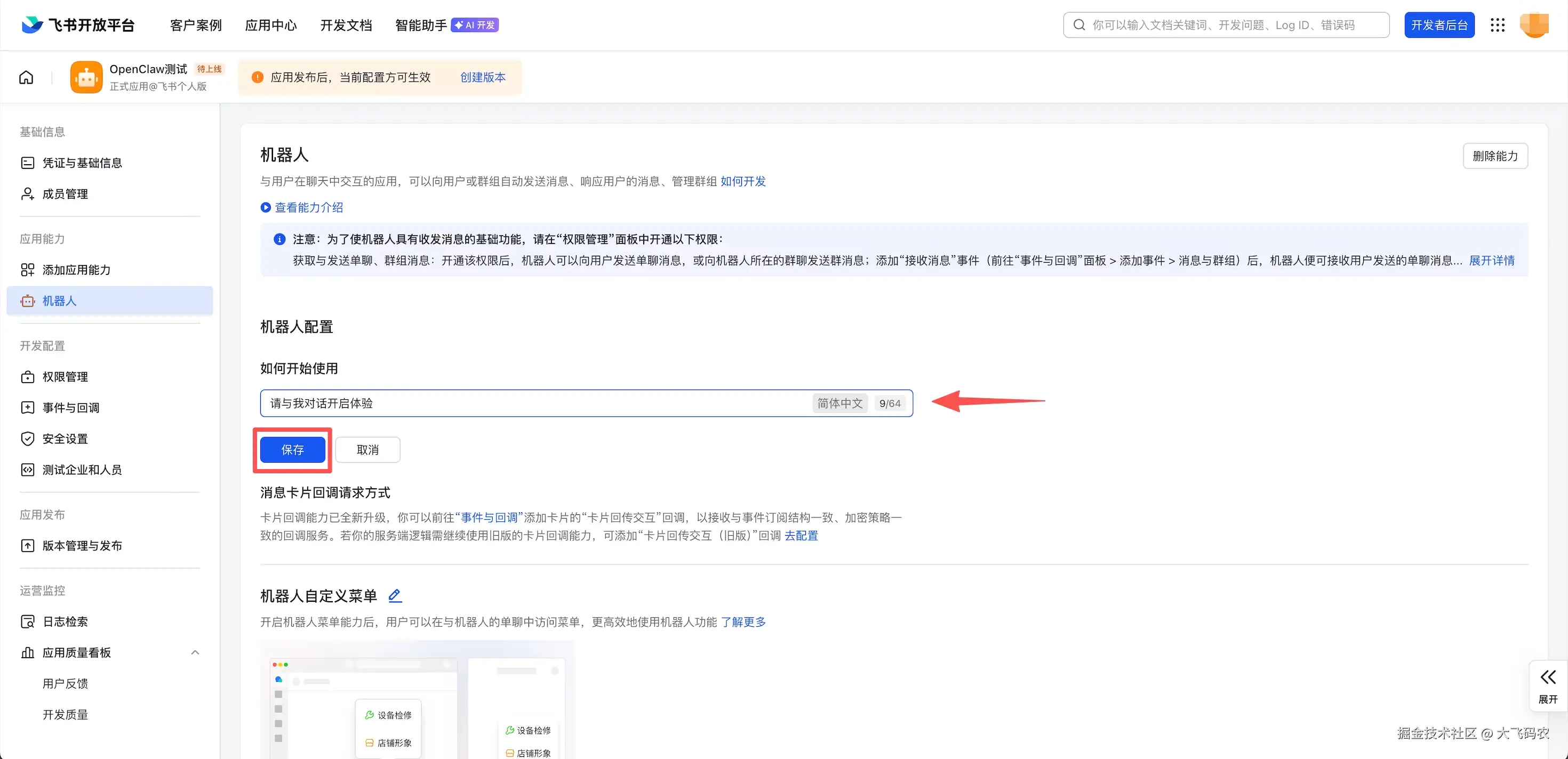 - 进入应用,选择配置机器人。填写机器人配置信息,完成后单击保存。