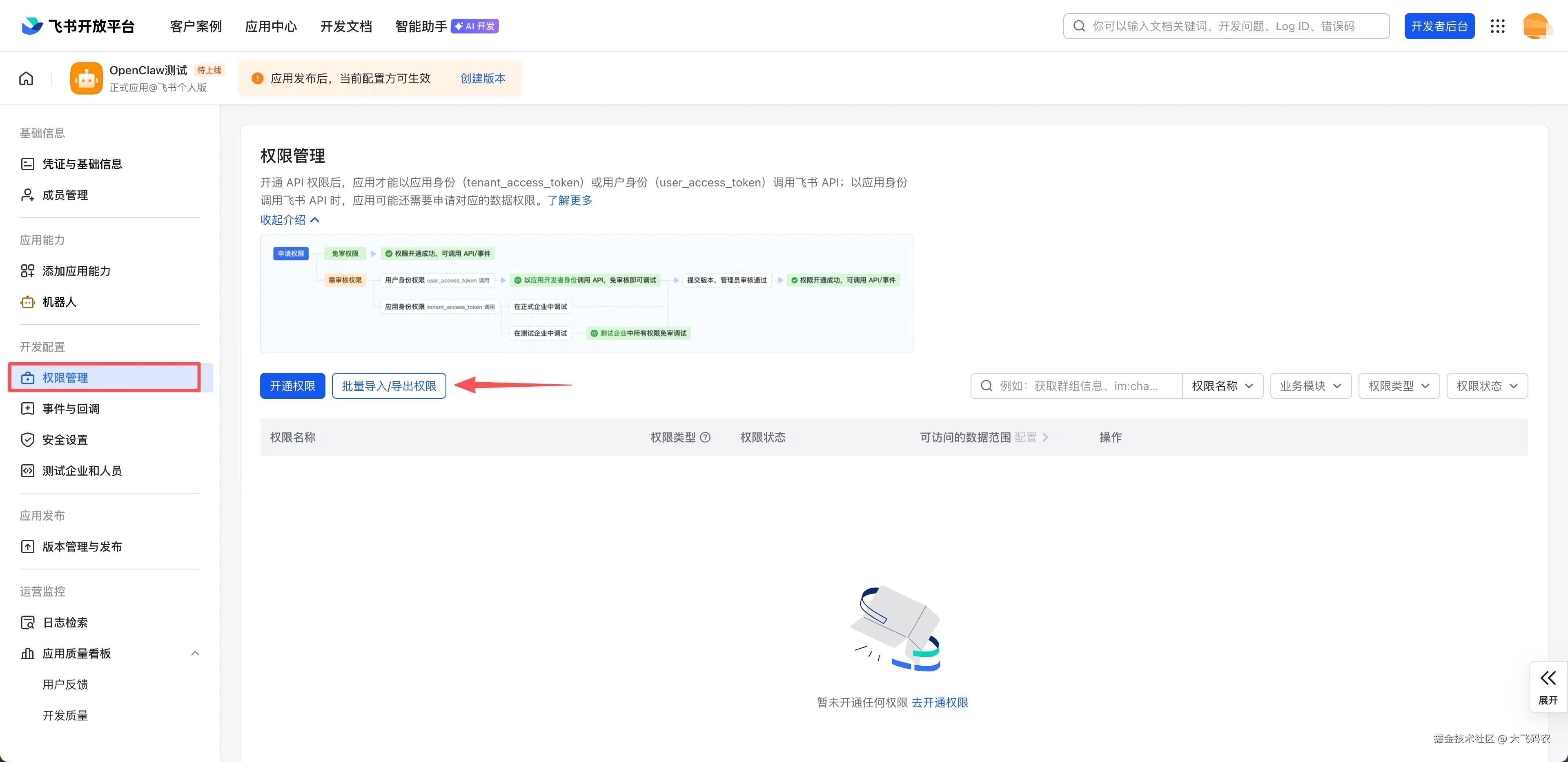 - 在左侧菜单选择权限管理,单击批量导入权限。