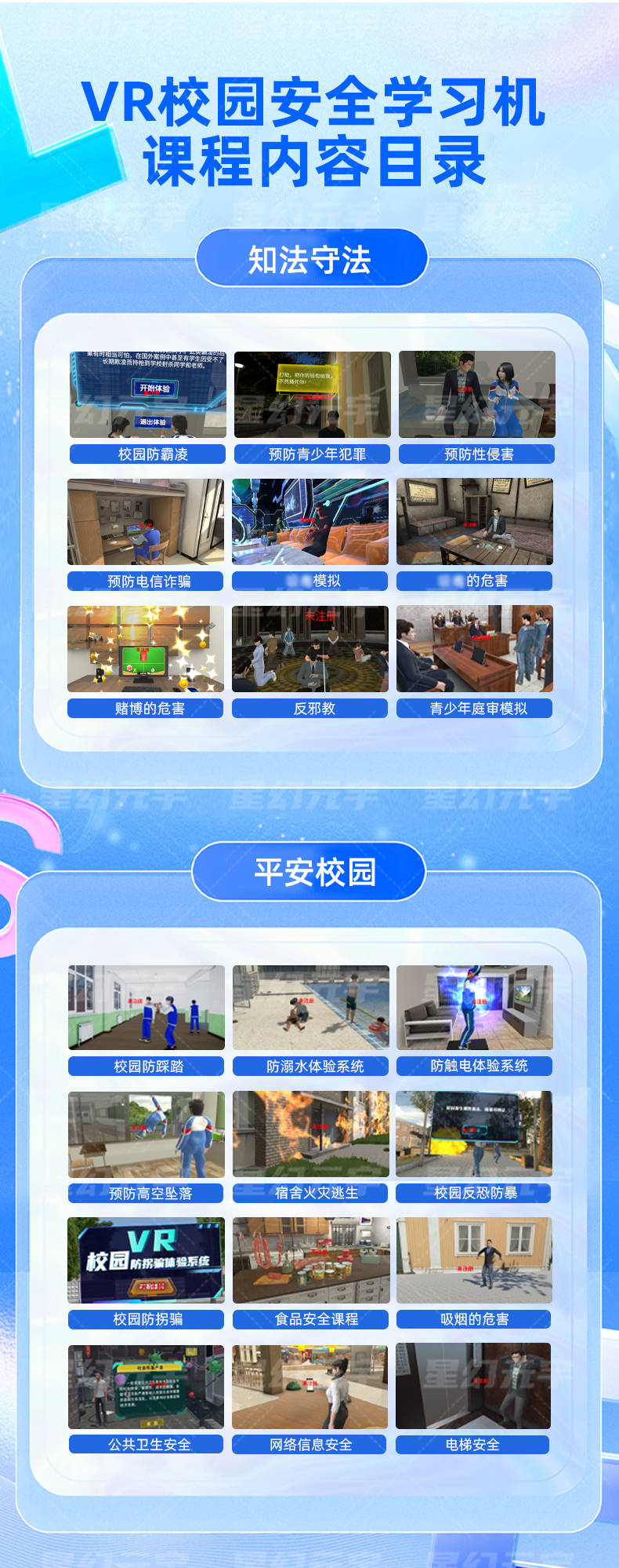 VR校园安全学习机并非简单的技术展示,而是围绕校园实际情况进行系统化设计,内容覆盖面广,实用性强,主要包括: