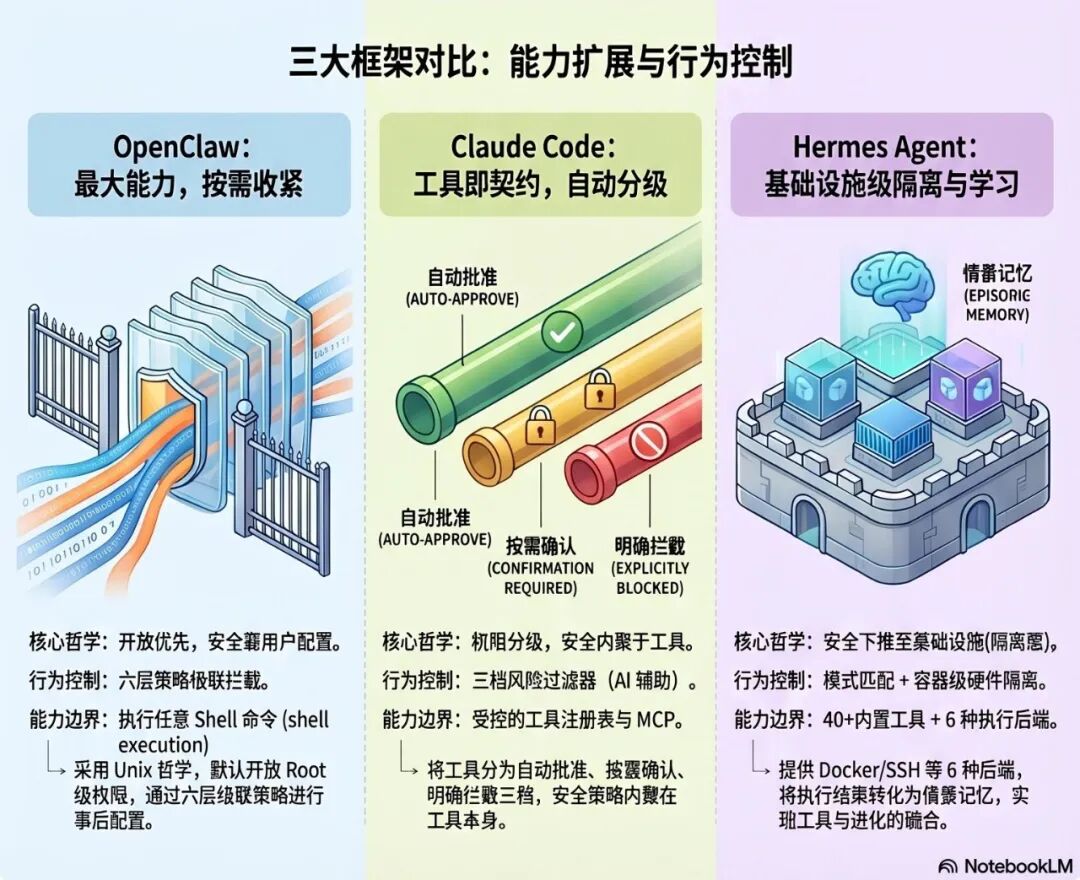 把三个框架的工具系统设计放在一起,能看到三种根本不同的安全哲学: