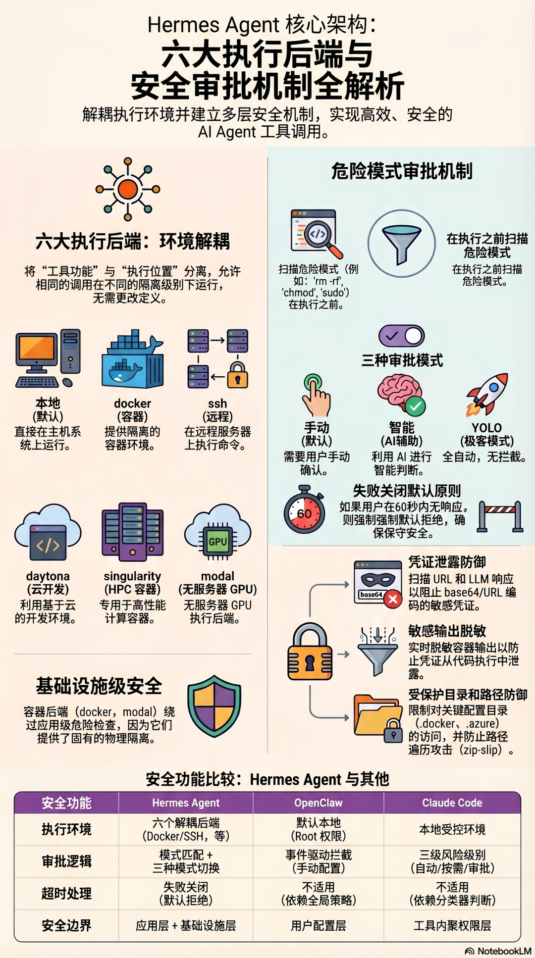 OpenClaw 和 Claude Code 的权限控制在应用层。Hermes Agent 的执行后端把安全下推到基础设施层(容器)。基础设施层的安全更可靠,但设置成本更高。
