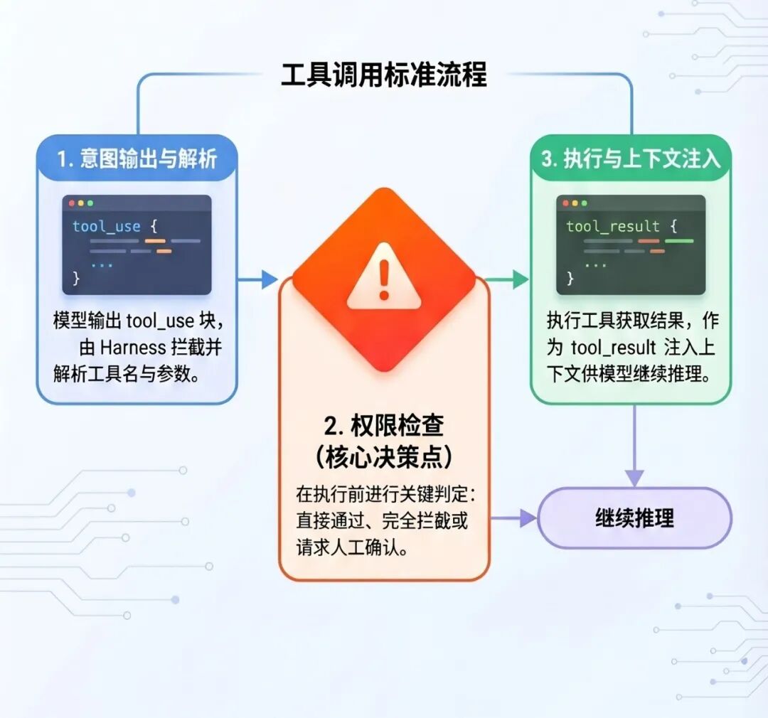 模型输出 tool_use 块 ↓Harness 拦截,解析工具名和参数 ↓权限检查(通过 / 拦截 / 请求确认) ↓执行工具,获取结果 ↓结果作为 tool_result 注入上下文 ↓模型继续推理