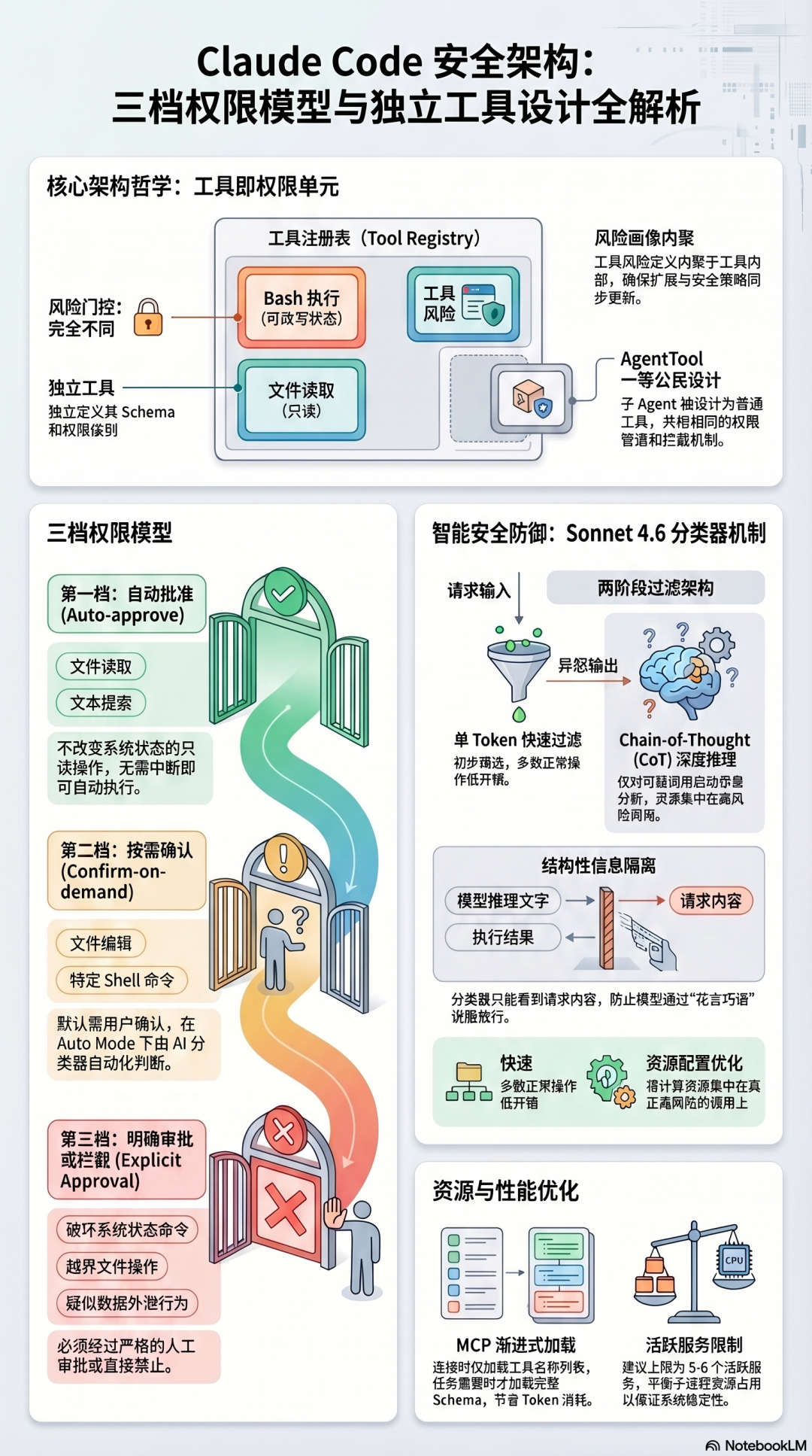 BashTool 和 FileReadTool 在同一个工具注册表里,但权限完全不同------Bash 执行可以修改系统状态,文件读取是只读的。架构用不同的权限门控来反映这种风险差异,而不是对所有工具应用统一策略。