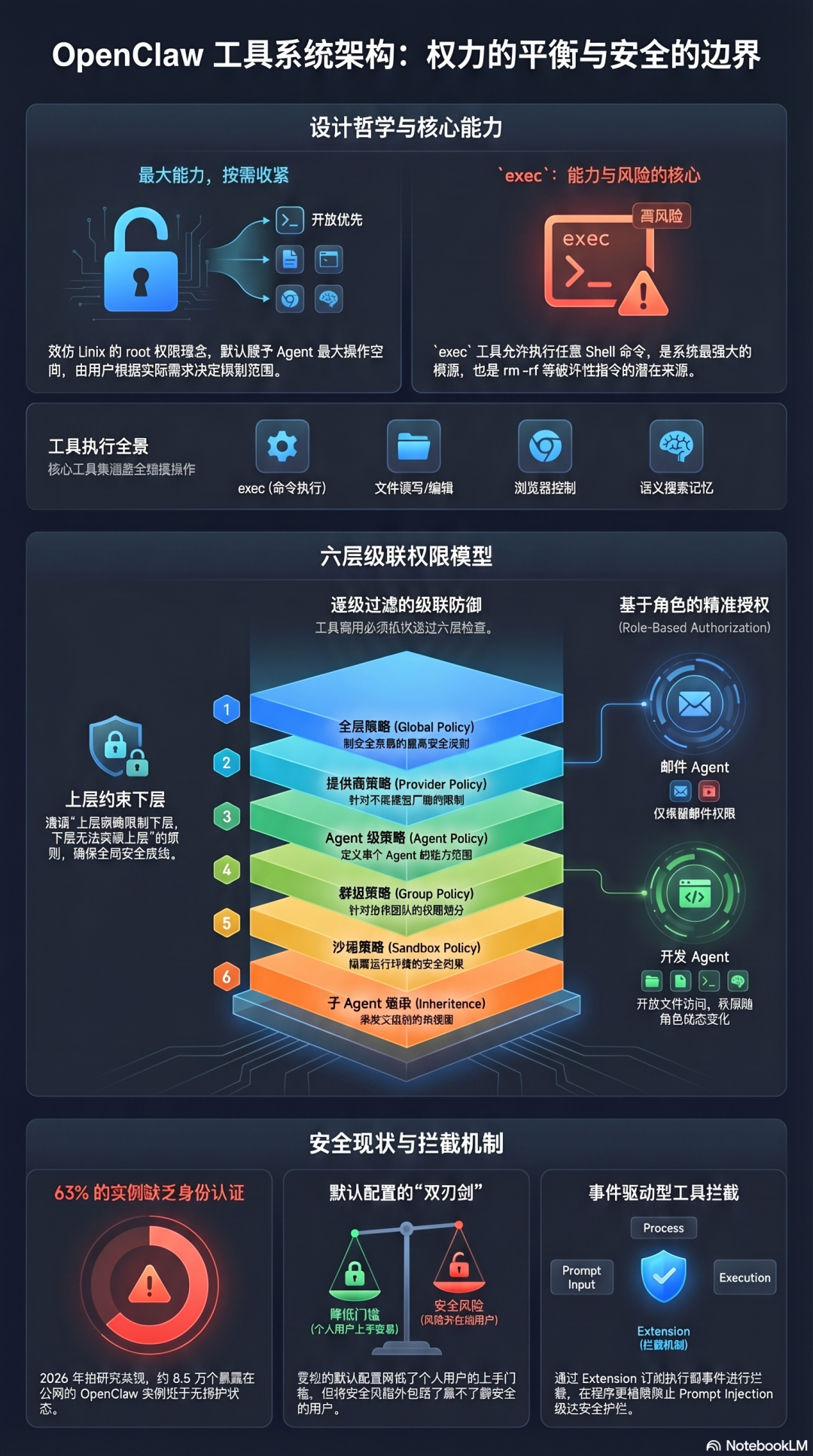 OpenClaw 的工具系统设计哲学是:默认给 Agent 最大的能力,让用户自己决定怎么收紧。