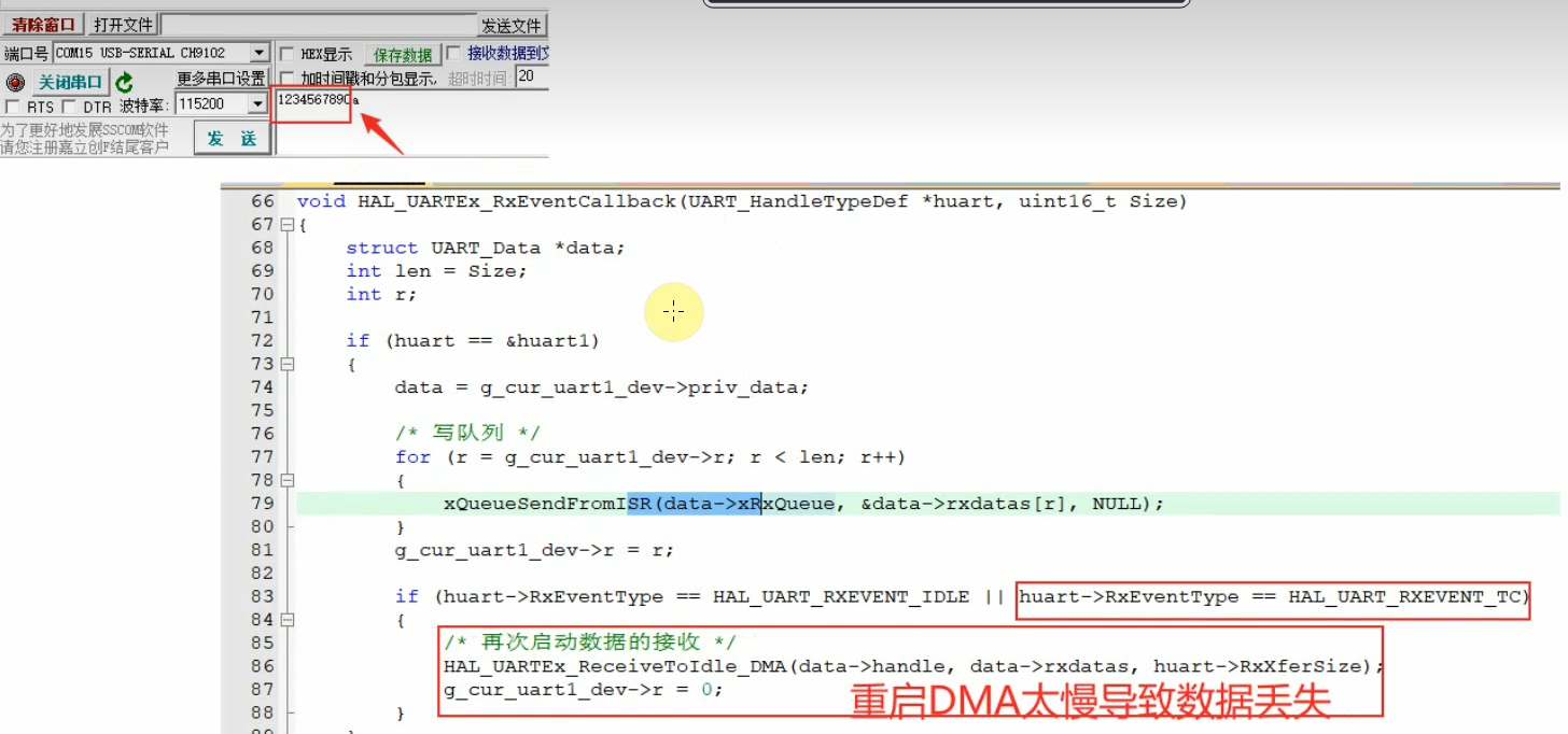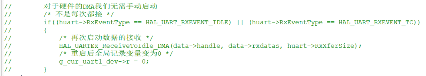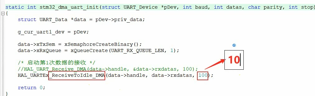 只需要我们再接收时候,开启一次DMA就可以了。以后都由硬件帮我们启动DMA。我们现在第一次设置的字节是100,当我们接收的数据超过100之后,硬件就会帮我们启动DMA。
