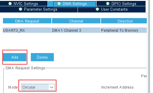 我们需要修改这里,来使得我们的接收DMA进入循环模式。我们不要让程序来启动DMA,要用硬件来启动DMA。